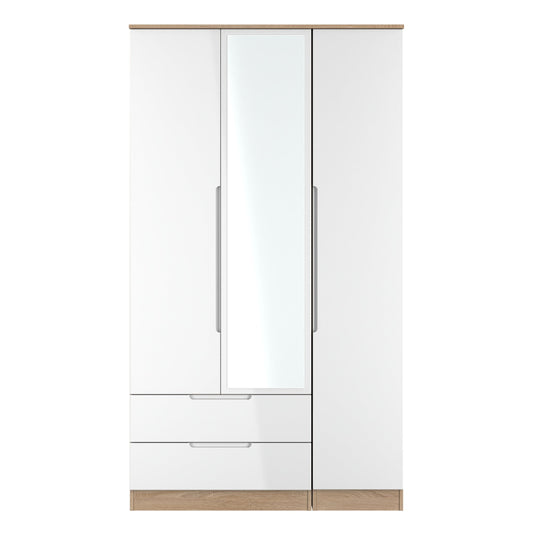 Milan Tall Mirror Wardrobe White & Oak 1 Shelf 2 Drawers 196cm