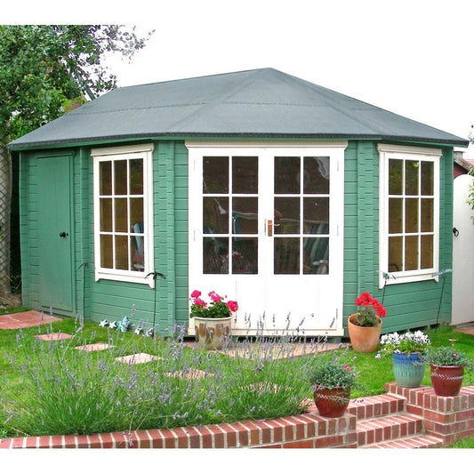 Shire Leygrove 14' x 10' Hexagonal Hip Log Cabin - Premium 28mm Cladding Tongue & Groove