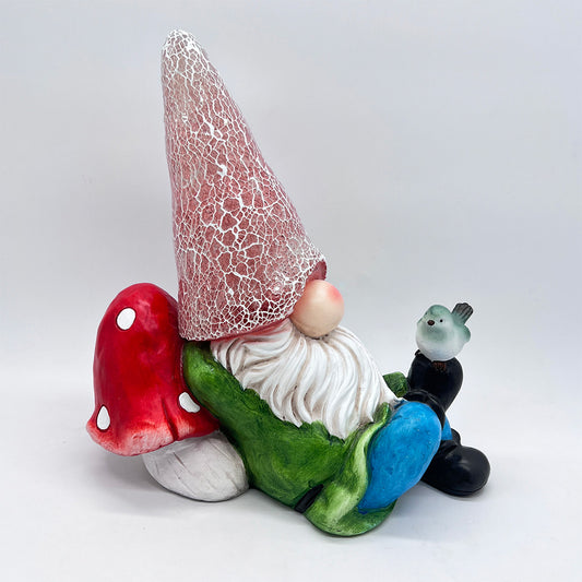 Three garden gnomes, potted and arranged on a patio, with one of them playfully lying down