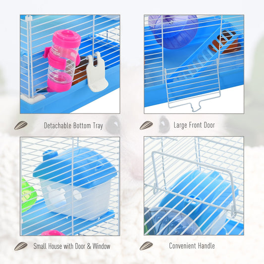 PawHut Portable 2 Storey Hamster Cage Small Pet Animal Cage Double Layers w/ Exercise Wheel Water Bott...