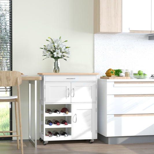Rolling Kitchen Island Trolley Cart Drawer Shelves Basket Wheels W/ 6 Bottle Wine Rack White