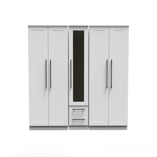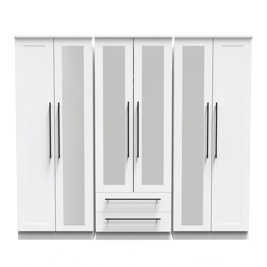 Beverley Tall Mirror Wardrobe White 6 Doors 2 Shelves 2 Drawers 222cm