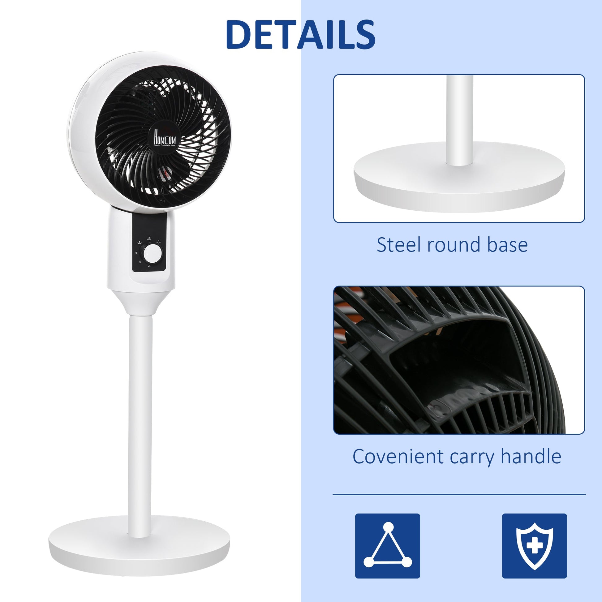 Stay comfortably cool during those hot summer afternoons and nights with this fan from HOMCOM. It is easy to use and perfect for home and office use. It features three variable speed settings for personalised comfort. The 70° oscillation, 90° vertical tilt allow you to direct air to a specific point. It's finished with a carry handle and rotary switch for easy operation