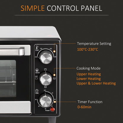 Whatever the space or size, it's easy to cook a wide variety of food with this HOMCOM mini convection oven. Comes with a removable wire rack and cooking tray, with three different holding levels to reposition easily. The heat range, between 100°C and 230°C, means you can cook at different temps - no unneeded burnt food! the 0-60 minutes timer means it will switch off when you need it to, without being in the same room. Comes complete with tray handle, so you don't have to touch hot metal.
