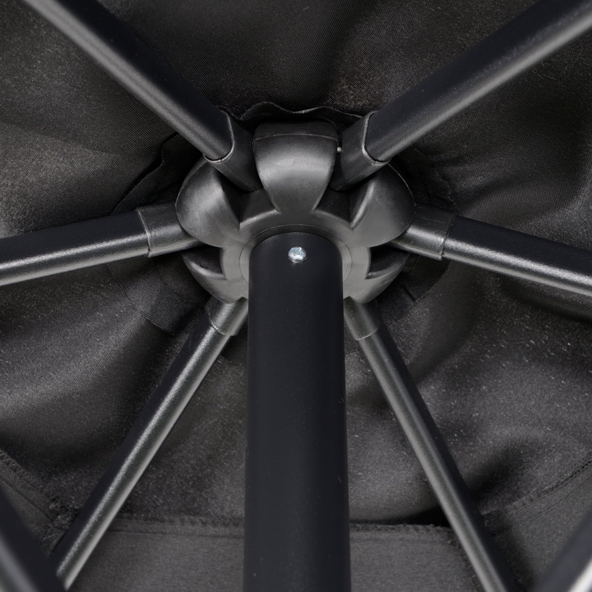 - Aluminium frame to keep parasol upright, connected to the canopy with six steel ribs