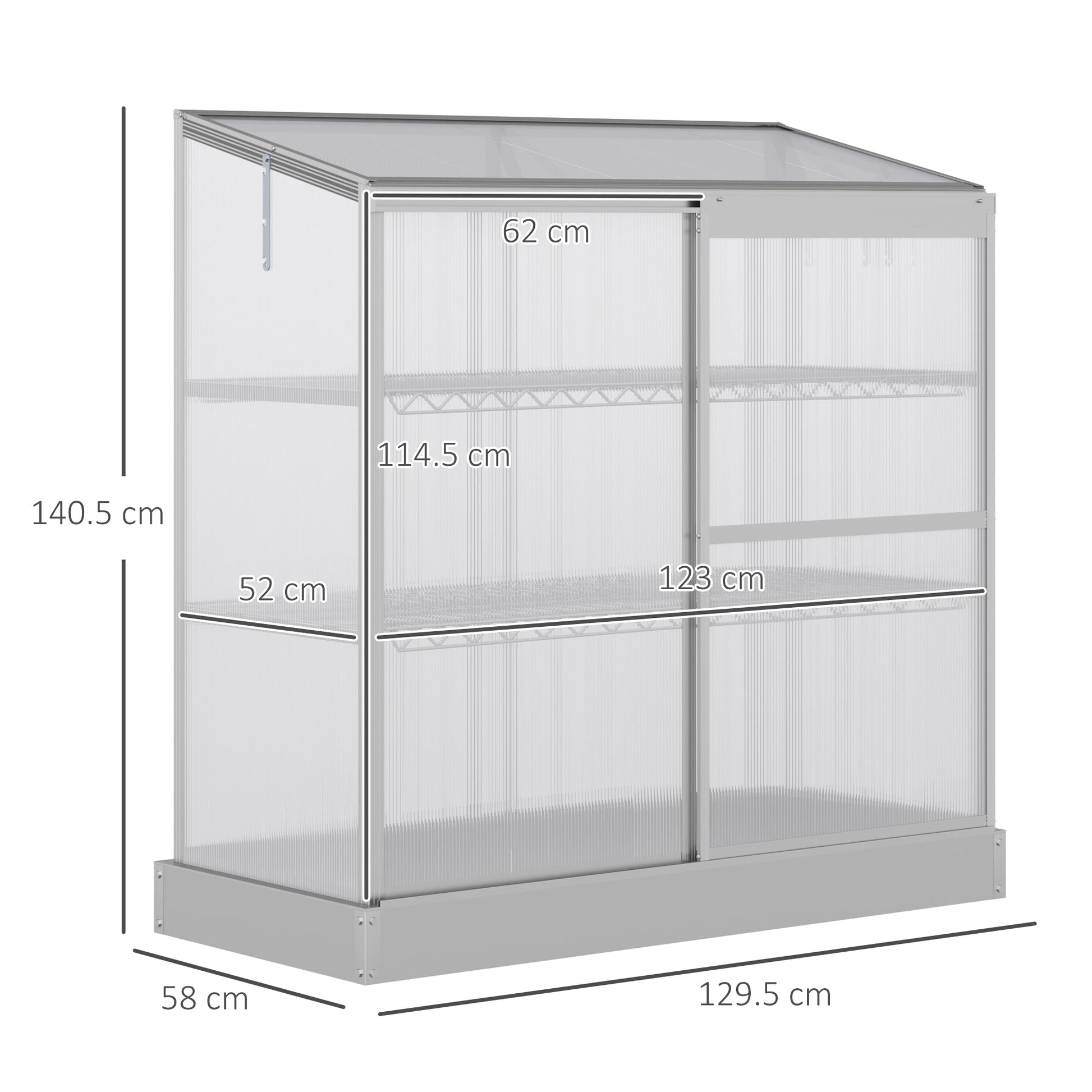 Give your plants and vegetables somewhere to enjoy the sunshine and grow heartily, thanks to this Aluminium Greenhouse from Outsunny. Small aluminium cold frame provides strength, with the polycarbonate panels protecting the inside from medium wind and rain, whilst allowing the sunlight to pass through. Inside two shelves are placed for organisation, with a lift-up lid and sliding door for easy access.