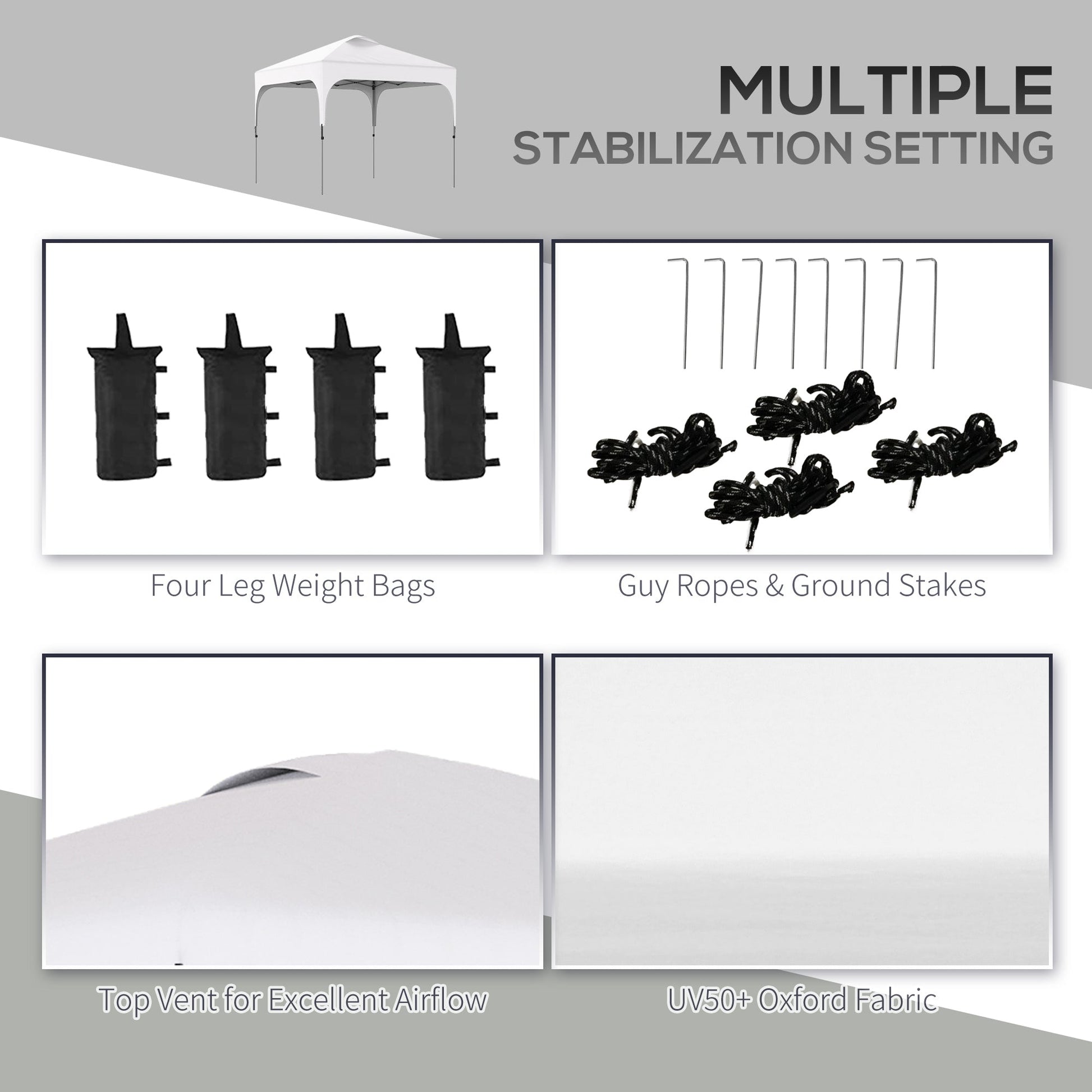 - Guy ropes, ground pegs and sand bags for extra support and weight