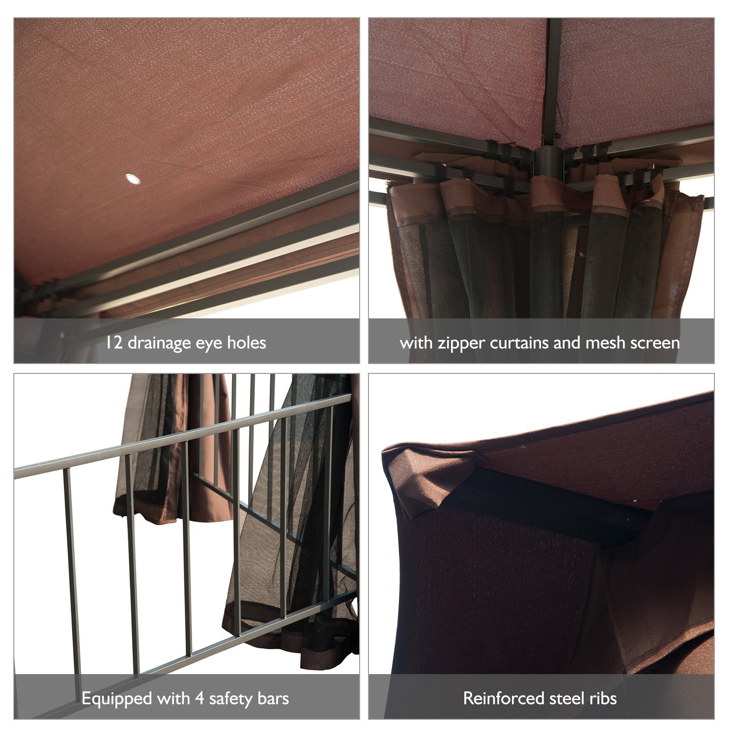 Find yourself in the protective cover of an Outsunny gazebo with sides and extend your outdoor enjoyment time. The garden pavilion offering you a stable protective covering making parties, weddings, and family gatherings fun. 12 drain holes ensure no water is pooled on top when it rains and the fabric is water, fade and UV resistant offering optimum protection. A powder-coated, rust-resistant steel frame built to last for years of usage.
