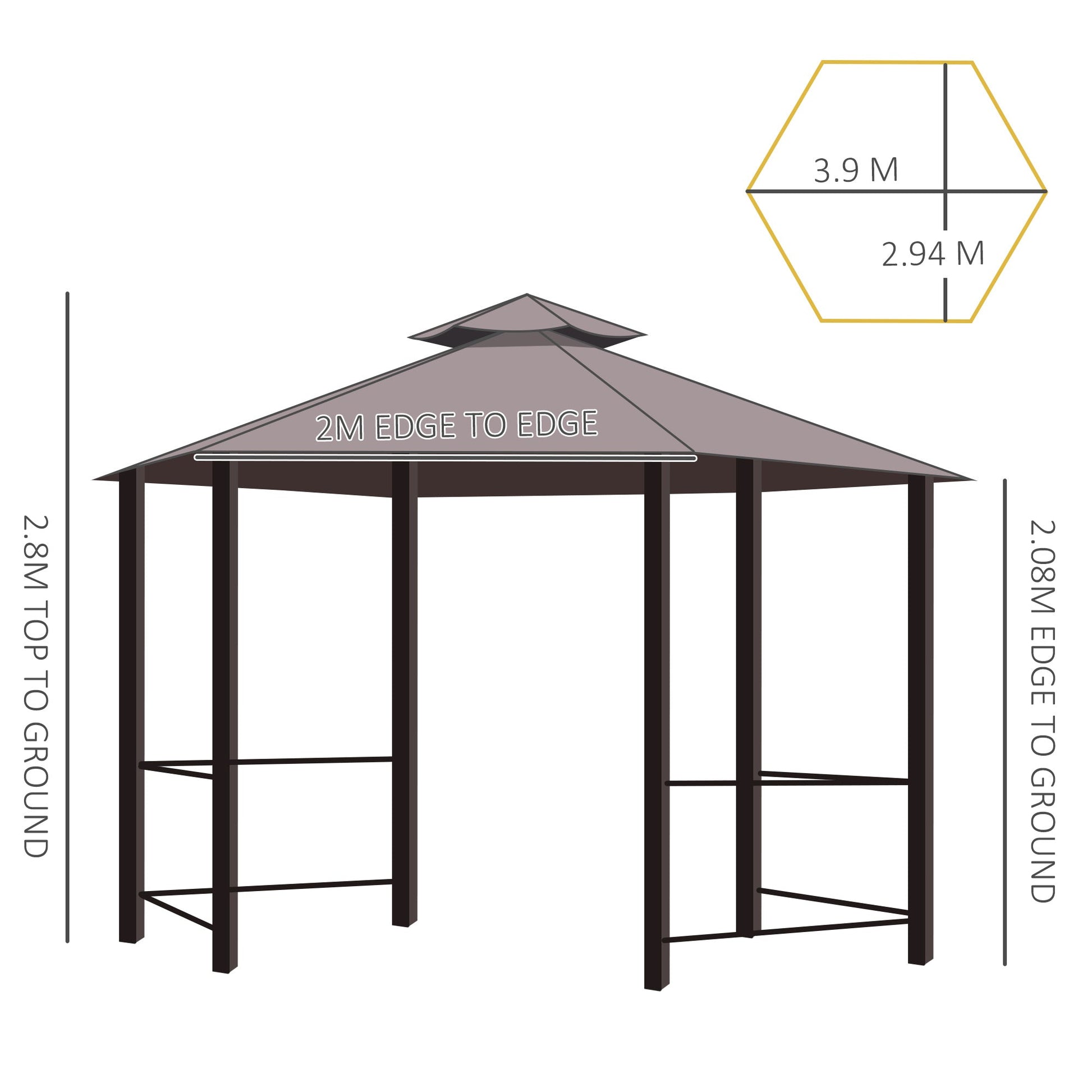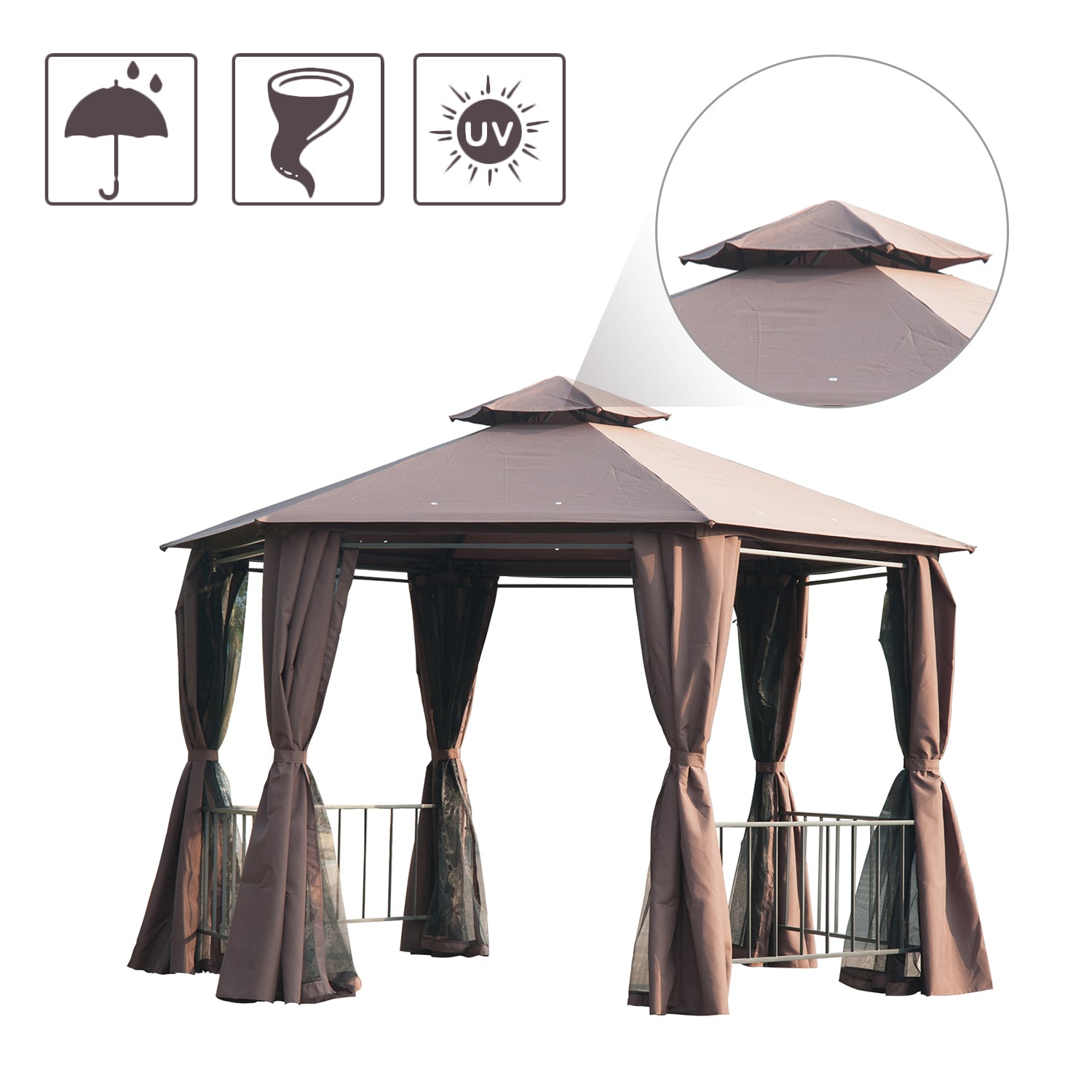 3 x 3M Hexagon Gazebo Patio Canopy Party Tent Outdoor Garden Shelter w/ 2 Tier Roof & Side Panel - Brown