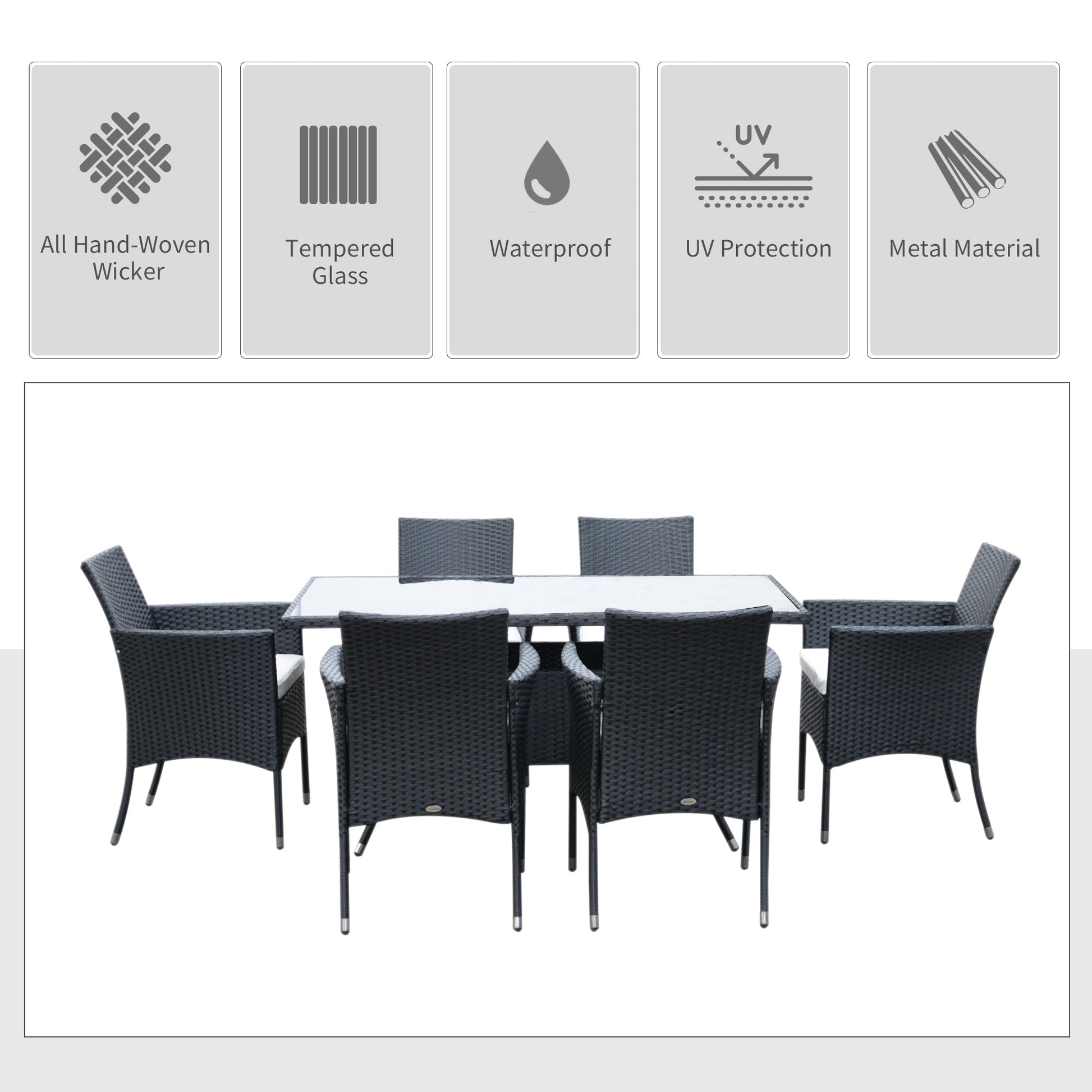 This deluxe 7piece rattan dining set is a great addition to patio or garden, made with high quality PE rattan and durable steel construction for sturdiness and long lasting. It also comes complete with a 5mm thick tempered glass for the table top, so you can use on a daily basis. It’s easy to maintain and keep clean using a damp cloth.