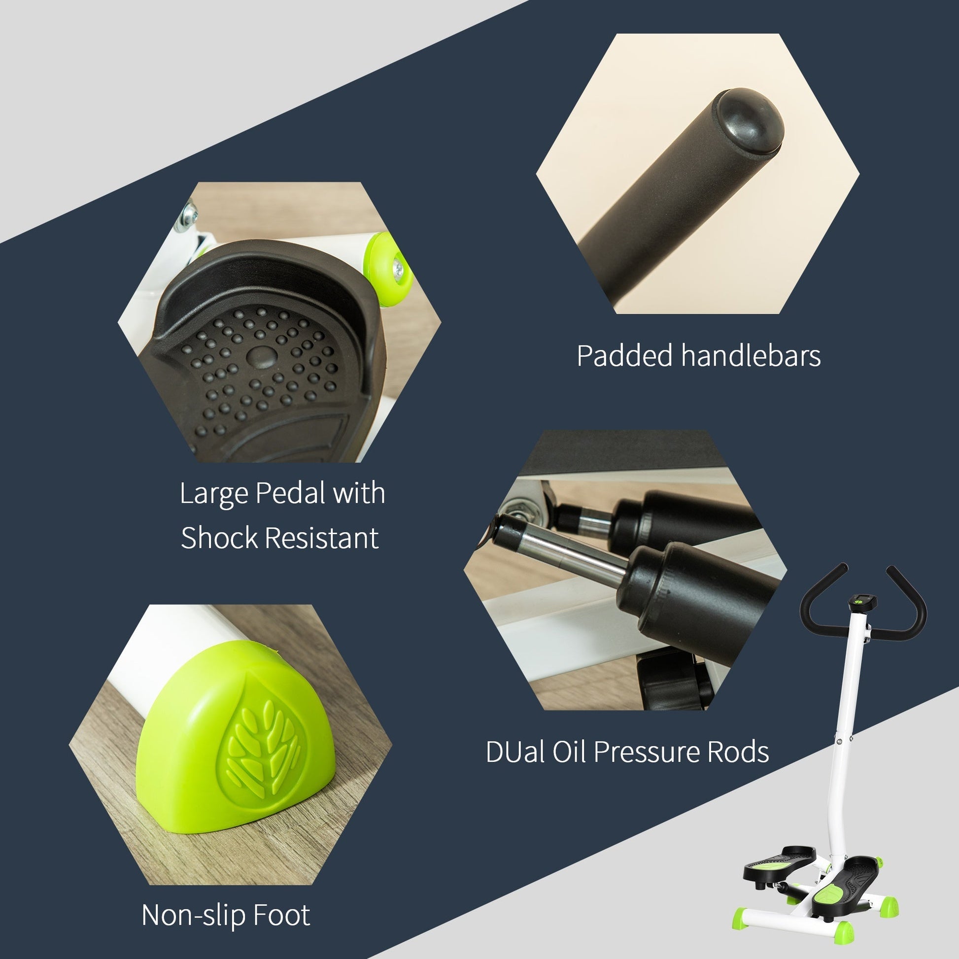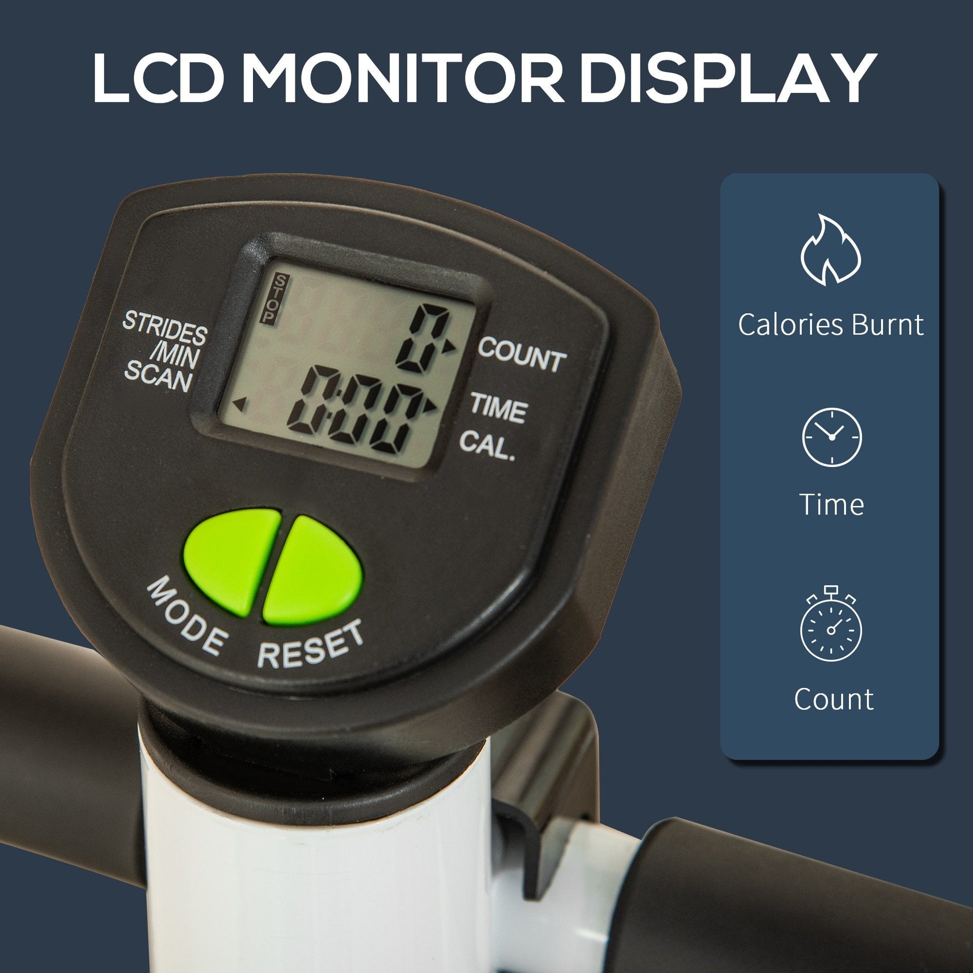 This HOMCOM stepper stand will help toning your calves, legs and surrounding areas of the body. A steel frame for a tough structure, it's fitted with two handlebars to hold on safely when working out. The large platforms with textured top help prevent feet slipping off. Comes complete with LCD screen - keeps track of total step count, time, and calories burnt.