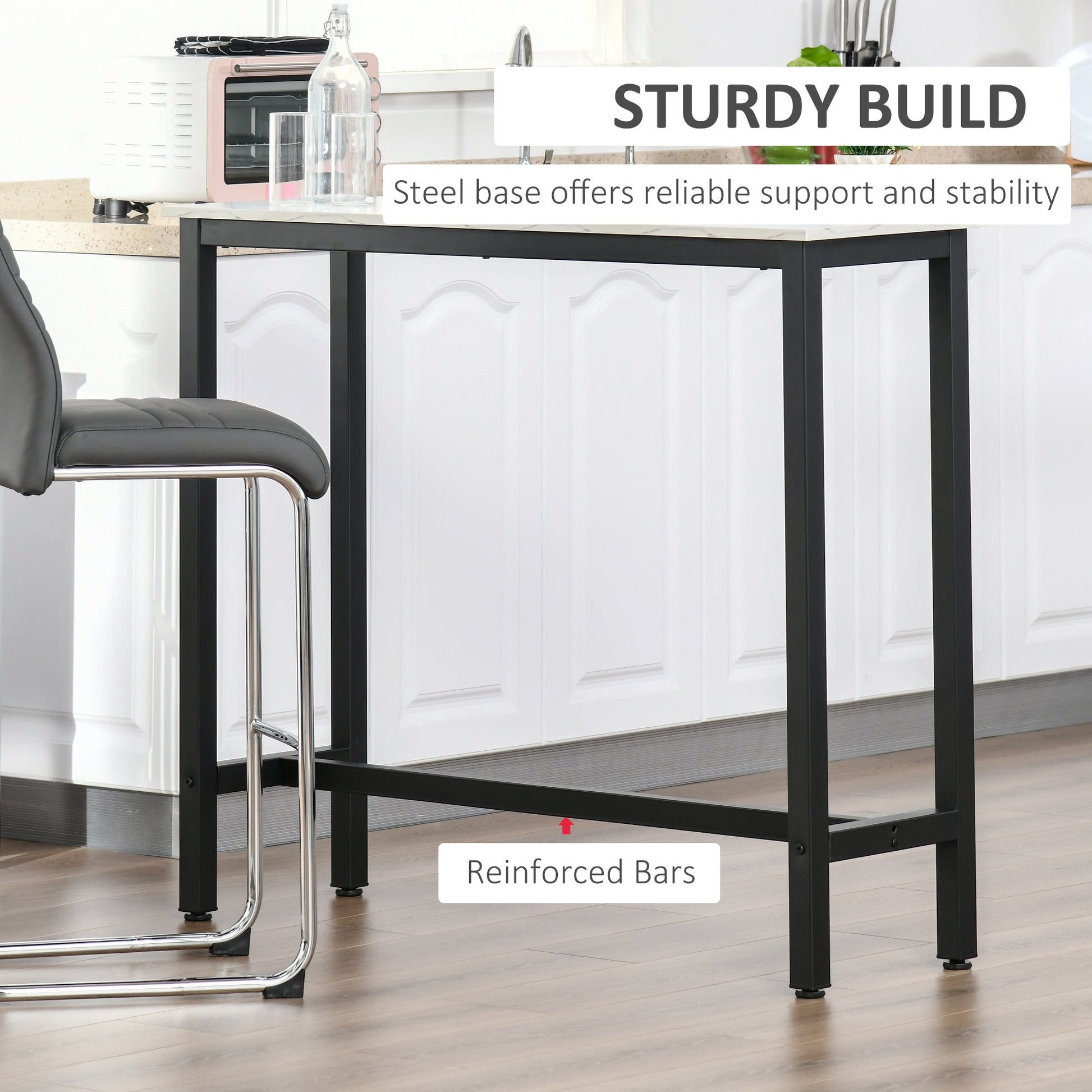 This small bar table from HOMCOM is a great place to relax with friends and family day and night. It comes with a marble-effect top for beauty, helping to elevate your current home decor effortlessly. The frame is made from metal, so it's tough and sturdy, with the particleboard top adding extra durability for everyday use. A practical addition for every home.