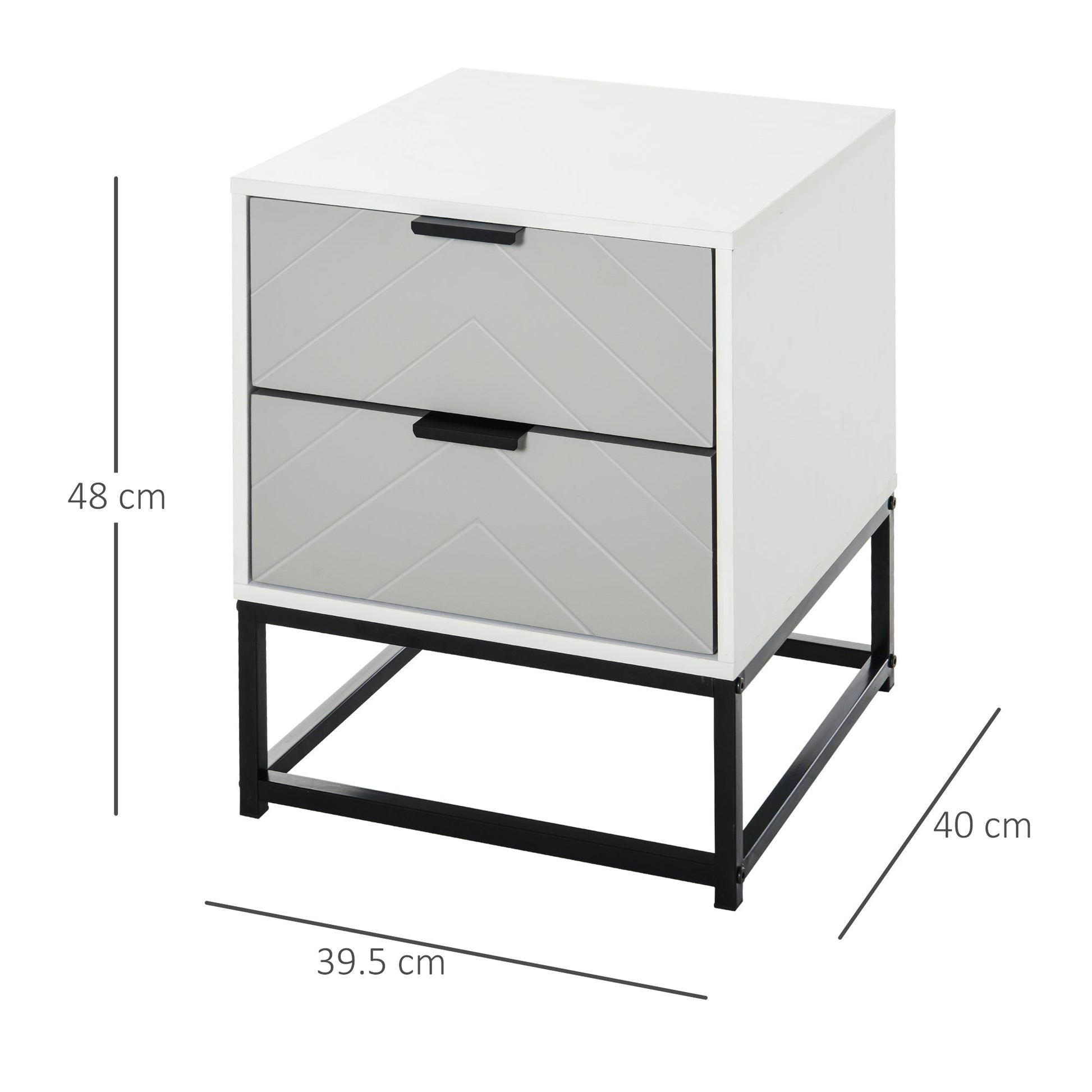 Keep stylish bedroom storage at the top of its game with this bedside table from HOMCOM. It's made with two drawers to give you handy storage room for all your bedtime essentials, with the inner metal runners and handles making them easy to open and close. The neutral grey and white colour scheme is versatile, with each drawer featuring an embossed chevron pattern for a unique look which will stand proudly for years to come. A large metal frame on the bottom to keep the table steady and protecting the bottom from damage. Subtle and unique styling done at its best.