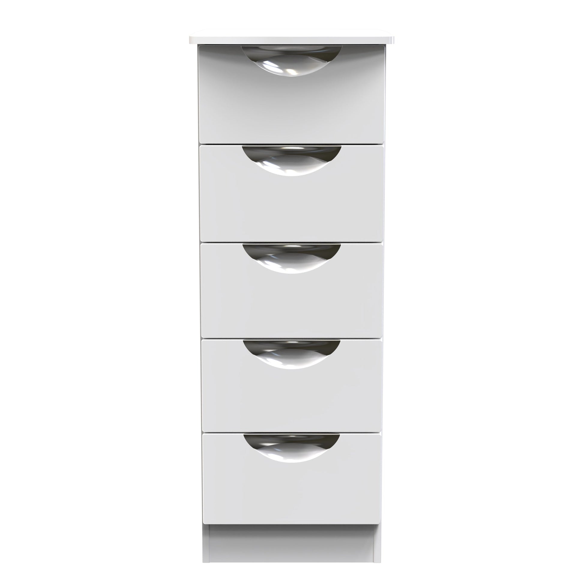 This 5 drawer chest of drawers is practical and stylish. Perfect for any home as a free standing storage unit. Boasting a clean, contemporary look and pleasing practicality, the furniture range makes a seamless addition to any modern looking home. The range offers an array of practical, organised space for items both large and small that will help keep your room neat and tidy. All pieces have a scratch-resistant veneer to help prevent the wear and tear that can come with everyday usage, while the extensive colour options of the drawers and doors is complemented by distinctive cut-out handles and a smooth finish for a great mix of style and functionality. All our furniture is made to order in the United Kingdom, to the highest quality. It is delivered within 10 working days direct to your location of choice by one of our two man delivery teams, and comes fully assembled (although legs may be removed to prevent damage in transit). Part of the Camden Collection.