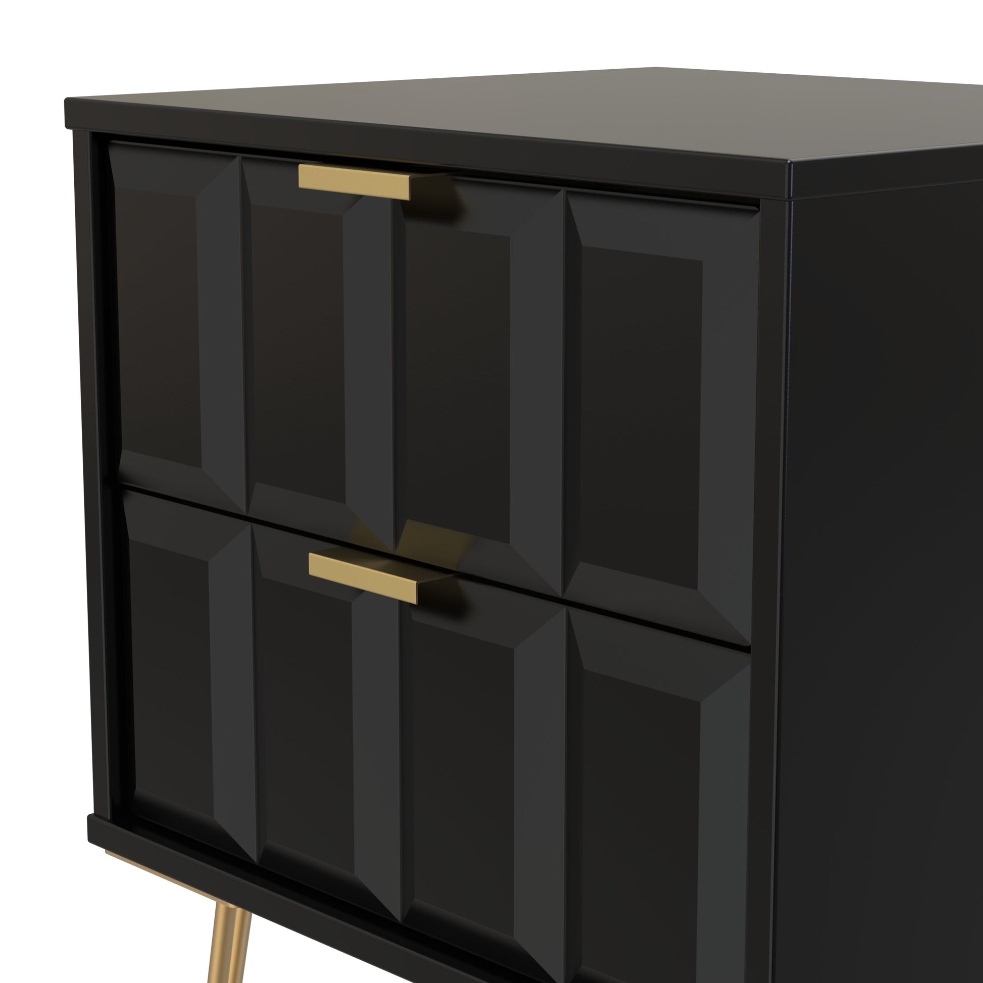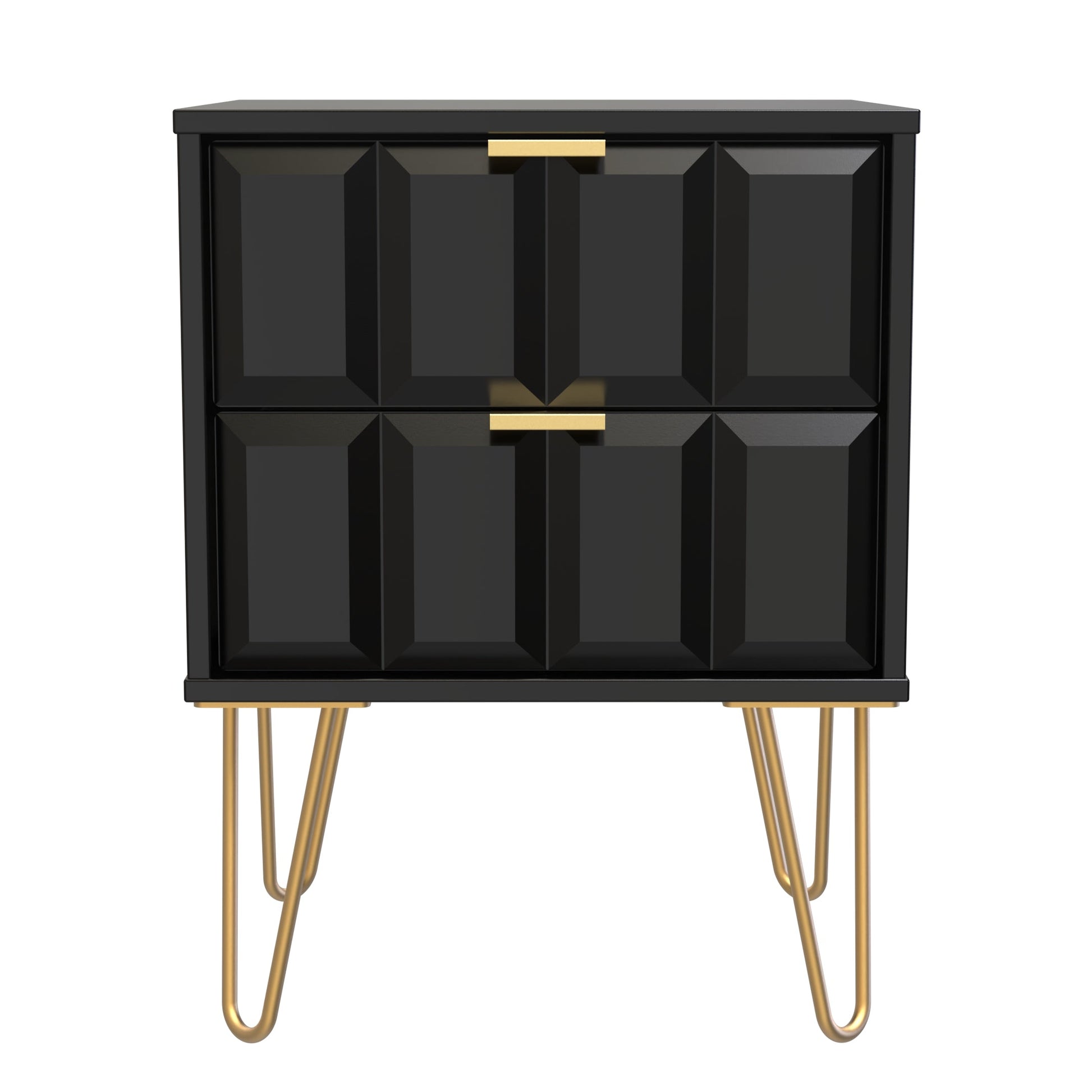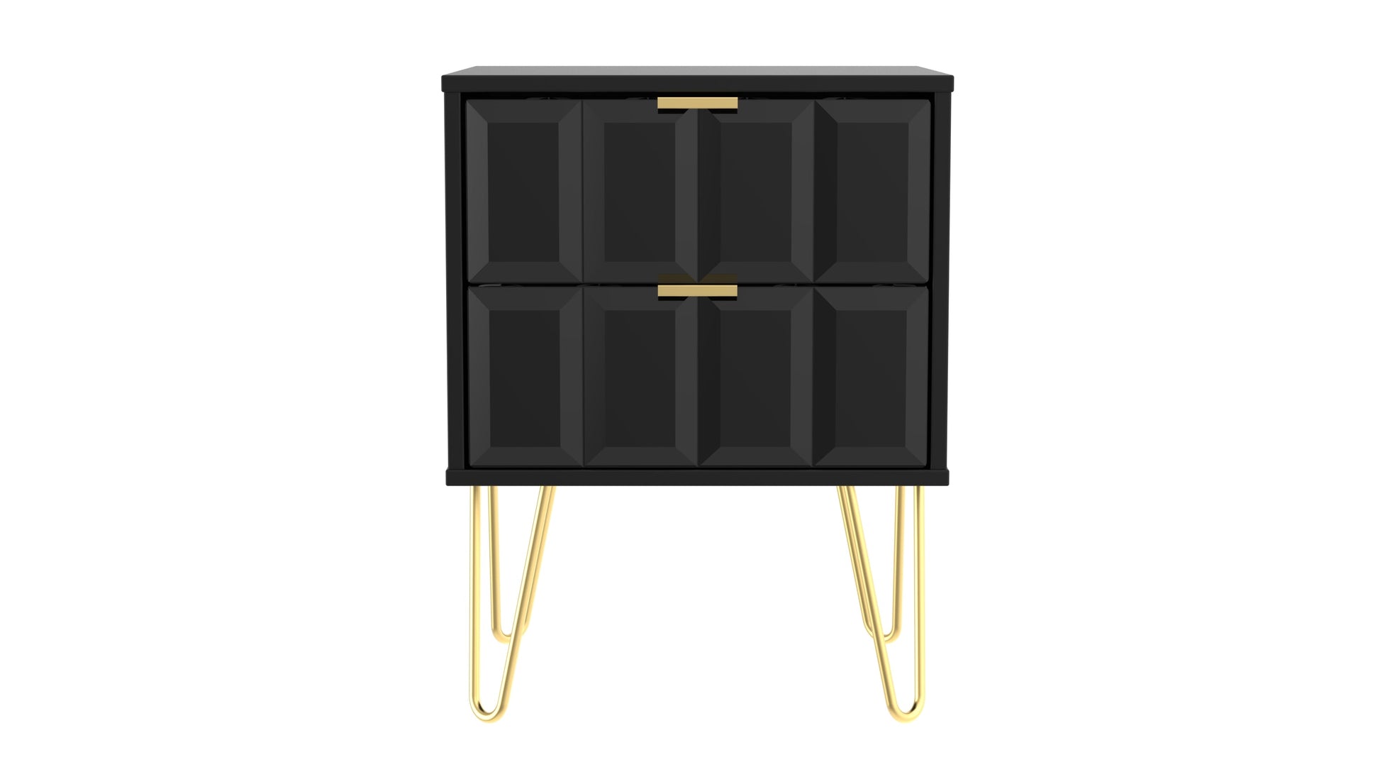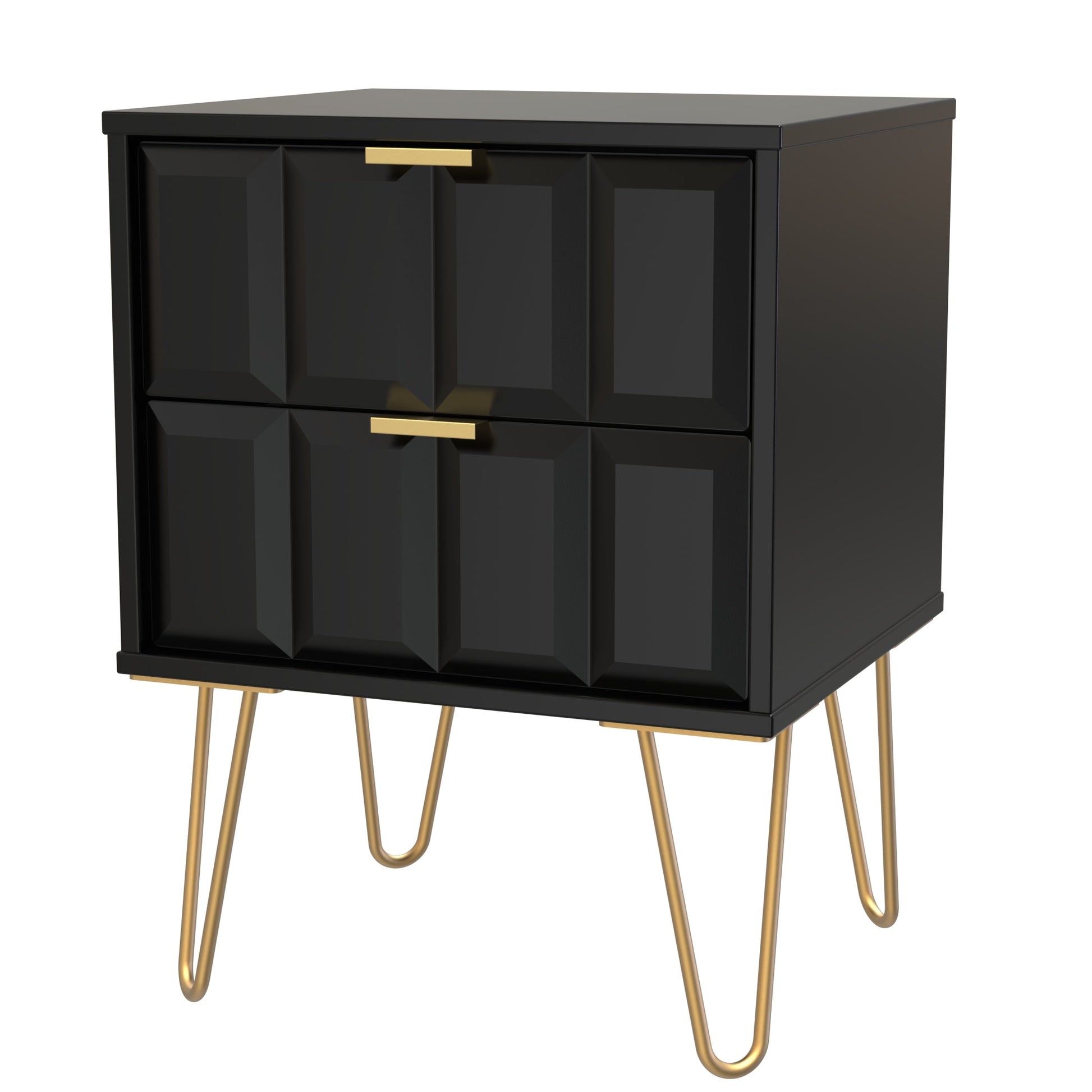 This 2 drawer bedside cabinet is practical and stylish. Perfect for any bedside or as a free standing storage unit. A modern and distinctive range. This ranges unique aesthetic is best represented by the distinctive "Cube" patten of the drawer and door fronts. Also features Gold Metal Handles and Gold Hairpin Legs. Comes in a wide range of colours including eye cathching two tone colour combinations. All our furniture is made to order in the United Kingdom, to the highest quality. It is delivered within 10 working days direct to your location of choice by one of our two man delivery teams, and comes fully assembled (although legs may be removed to prevent damage in transit). Part of the Cube Collection.