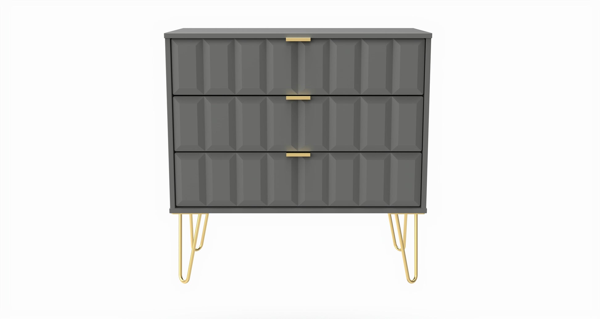 This wide 3 drawer chest of drawers is practical and stylish. Perfect for any home as a free standing storage unit. A modern and distinctive range. This ranges unique aesthetic is best represented by the distinctive "Cube" patten of the drawer and door fronts. Also features Gold Metal Handles and Gold Hairpin Legs. Comes in a wide range of colours including eye cathching two tone colour combinations. All our furniture is made to order in the United Kingdom, to the highest quality. It is delivered within 10 working days direct to your location of choice by one of our two man delivery teams, and comes fully assembled (although legs may be removed to prevent damage in transit). Part of the Cube Collection.