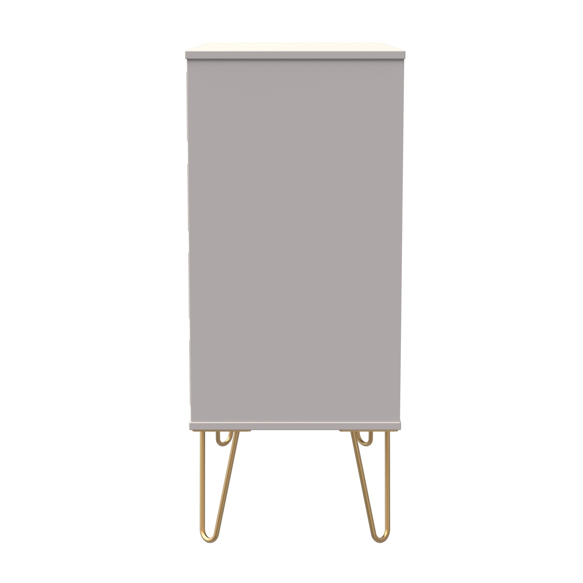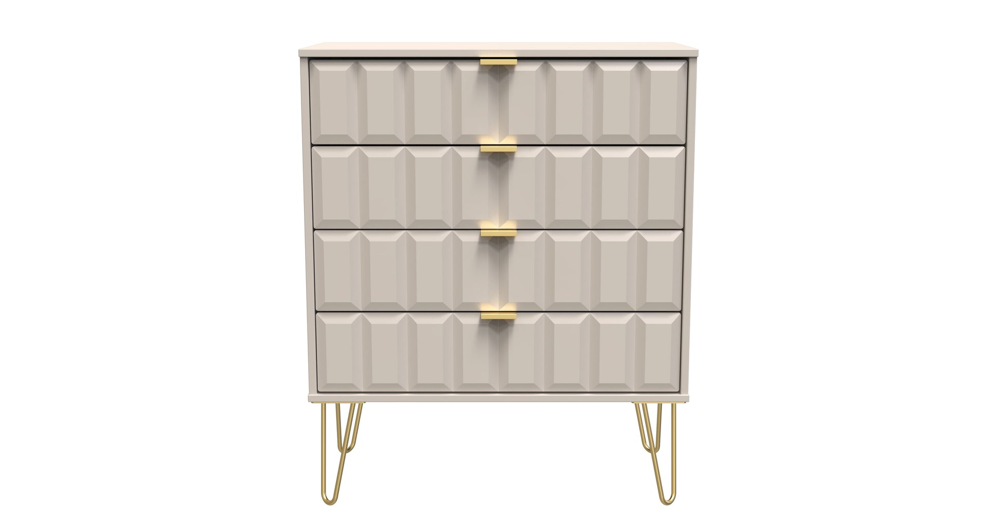 This wide 4 drawer chest of drawers is practical and stylish. Perfect for any home as a free standing storage unit. A modern and distinctive range. This ranges unique aesthetic is best represented by the distinctive "Cube" patten of the drawer and door fronts. Also features Gold Metal Handles and Gold Hairpin Legs. Comes in a wide range of colours including eye cathching two tone colour combinations. All our furniture is made to order in the United Kingdom, to the highest quality. It is delivered within 10 working days direct to your location of choice by one of our two man delivery teams, and comes fully assembled (although legs may be removed to prevent damage in transit). Part of the Cube Collection.