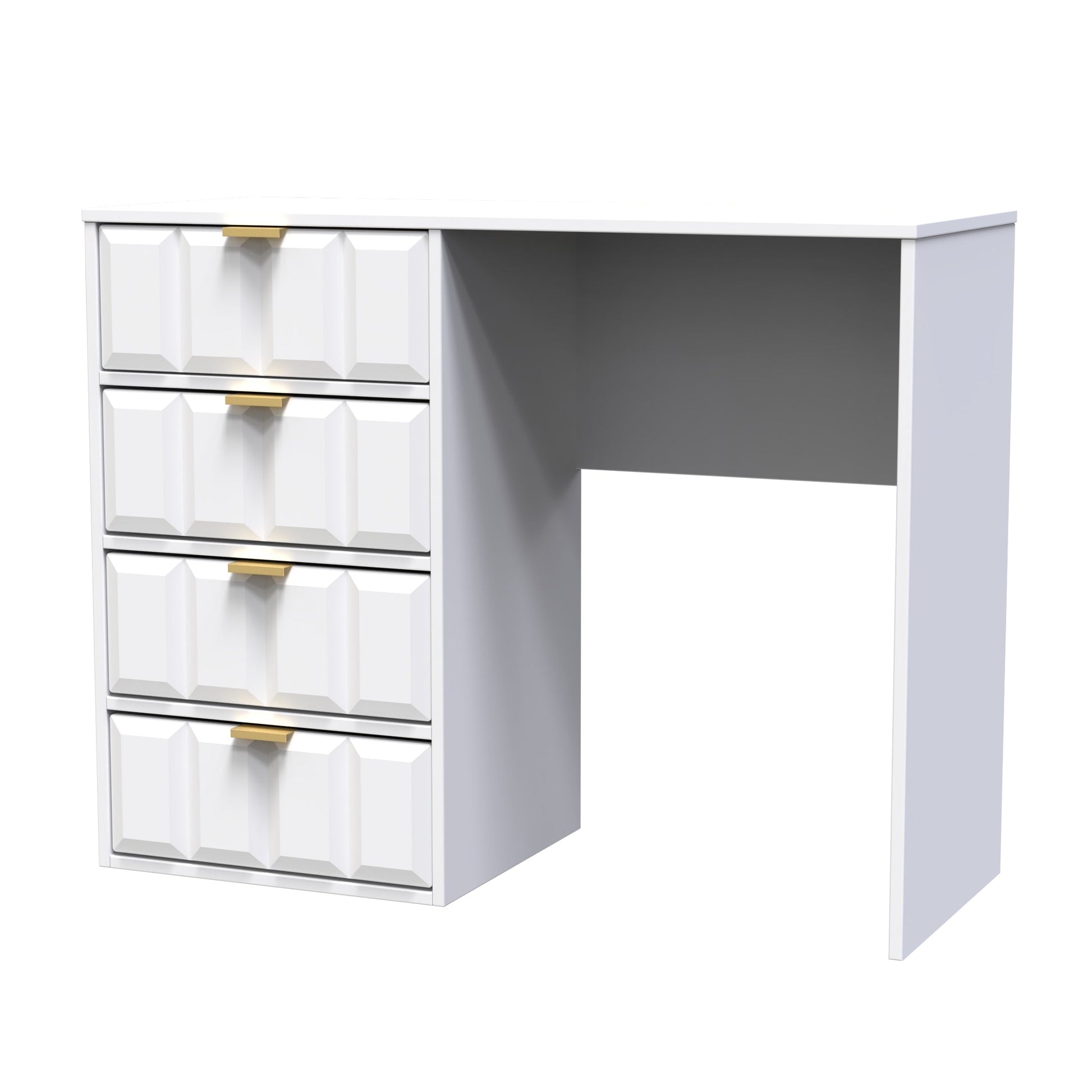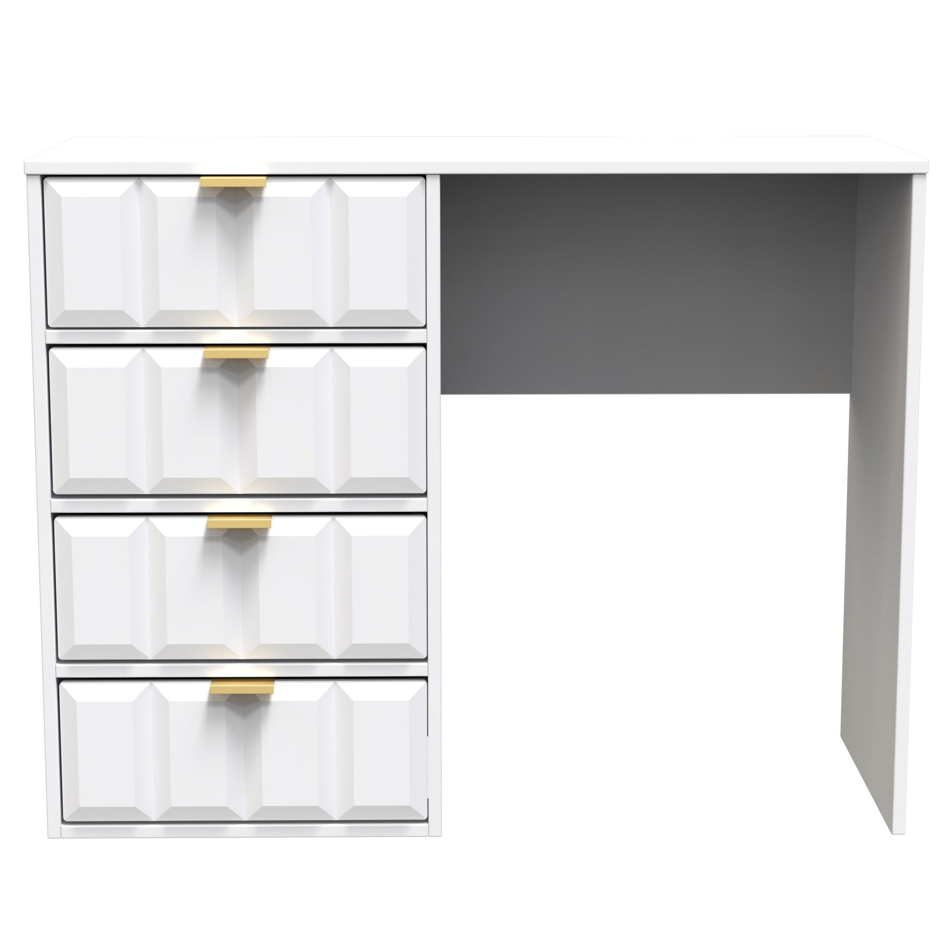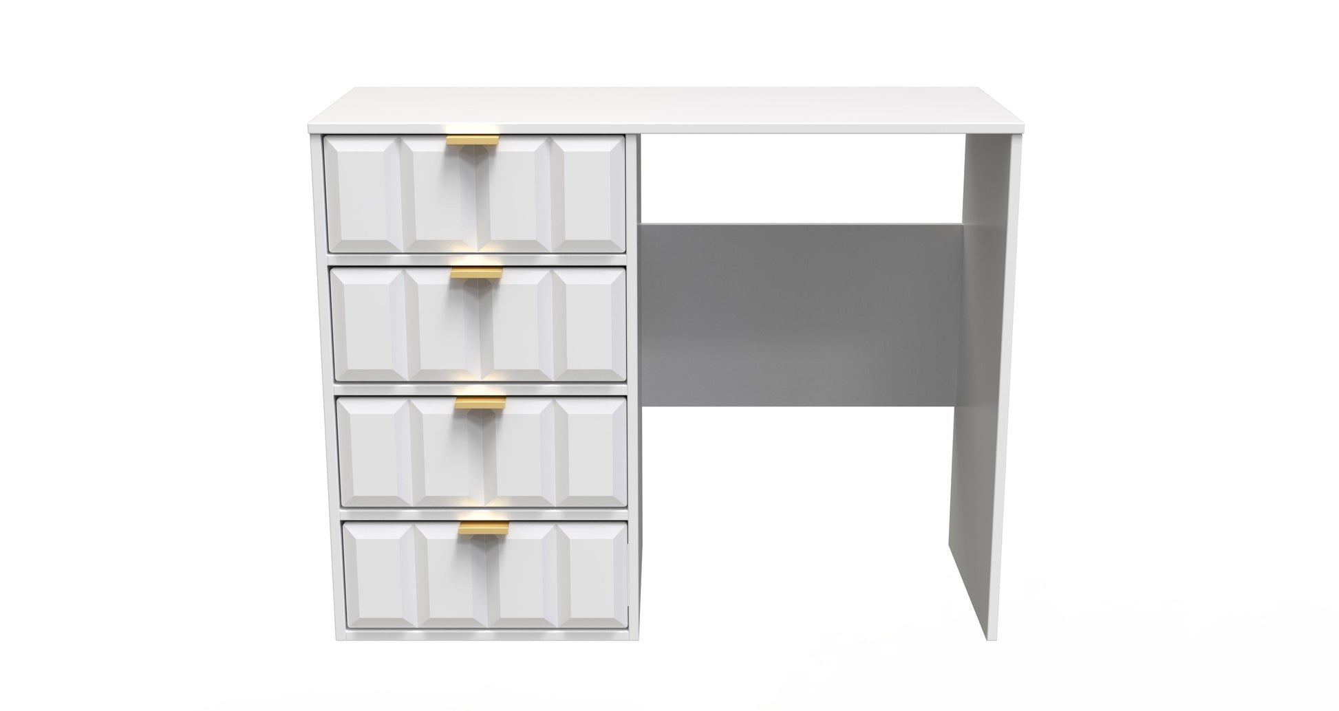 This 4 Drawer Vanity/Desk is equally at home in the bedroom or the office. A modern and distinctive range. This ranges unique aesthetic is best represented by the distinctive "Cube" patten of the drawer and door fronts. Also features Gold Metal Handles and Gold Hairpin Legs. Comes in a wide range of colours including eye cathching two tone colour combinations. All our furniture is made to order in the United Kingdom, to the highest quality. It is delivered within 10 working days direct to your location of choice by one of our two man delivery teams, and comes fully assembled (although legs may be removed to prevent damage in transit). Part of the Cube Collection.