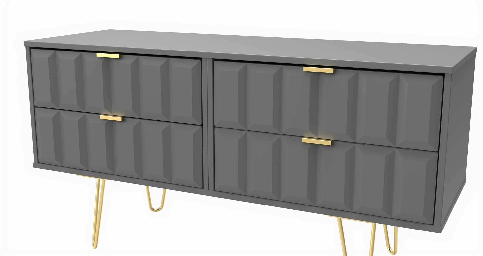 A large 4 drawer bed box. A Perfect storage solution for any room (not just the end of your bed). Could also be used as a low level TV/Media stand. A modern and distinctive range. This ranges unique aesthetic is best represented by the distinctive "Cube" patten of the drawer and door fronts. Also features Gold Metal Handles and Gold Hairpin Legs. Comes in a wide range of colours including eye cathching two tone colour combinations. All our furniture is made to order in the United Kingdom, to the highest quality. It is delivered within 10 working days direct to your location of choice by one of our two man delivery teams, and comes fully assembled (although legs may be removed to prevent damage in transit). Part of the Cube Collection.