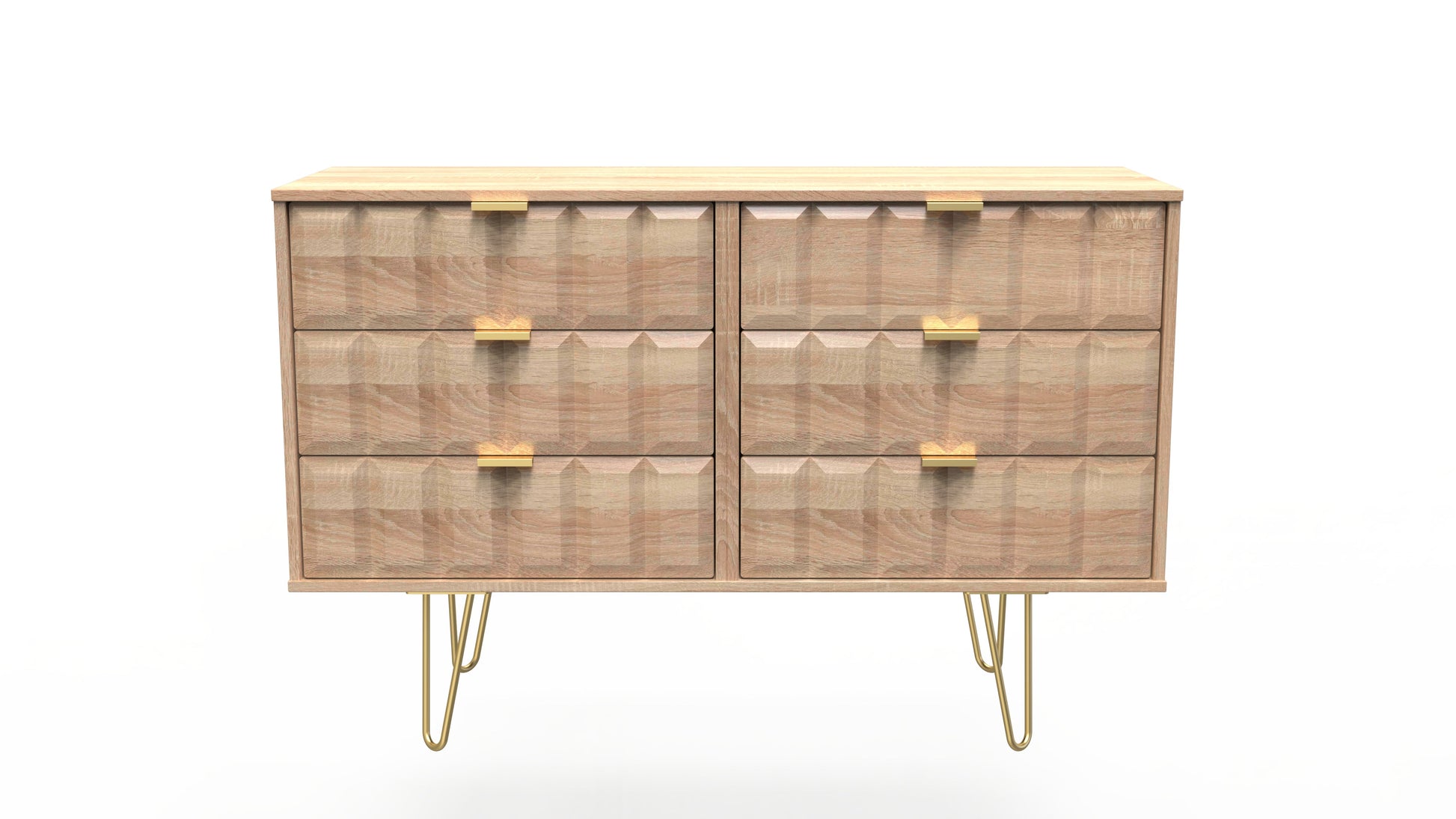 This double width 6 drawer chest of drawers is practical and stylish. Perfect for any home as a free standing storage unit. A modern and distinctive range. This ranges unique aesthetic is best represented by the distinctive "Cube" patten of the drawer and door fronts. Also features Gold Metal Handles and Gold Hairpin Legs. Comes in a wide range of colours including eye cathching two tone colour combinations. All our furniture is made to order in the United Kingdom, to the highest quality. It is delivered within 10 working days direct to your location of choice by one of our two man delivery teams, and comes fully assembled (although legs may be removed to prevent damage in transit). Part of the Cube Collection.
