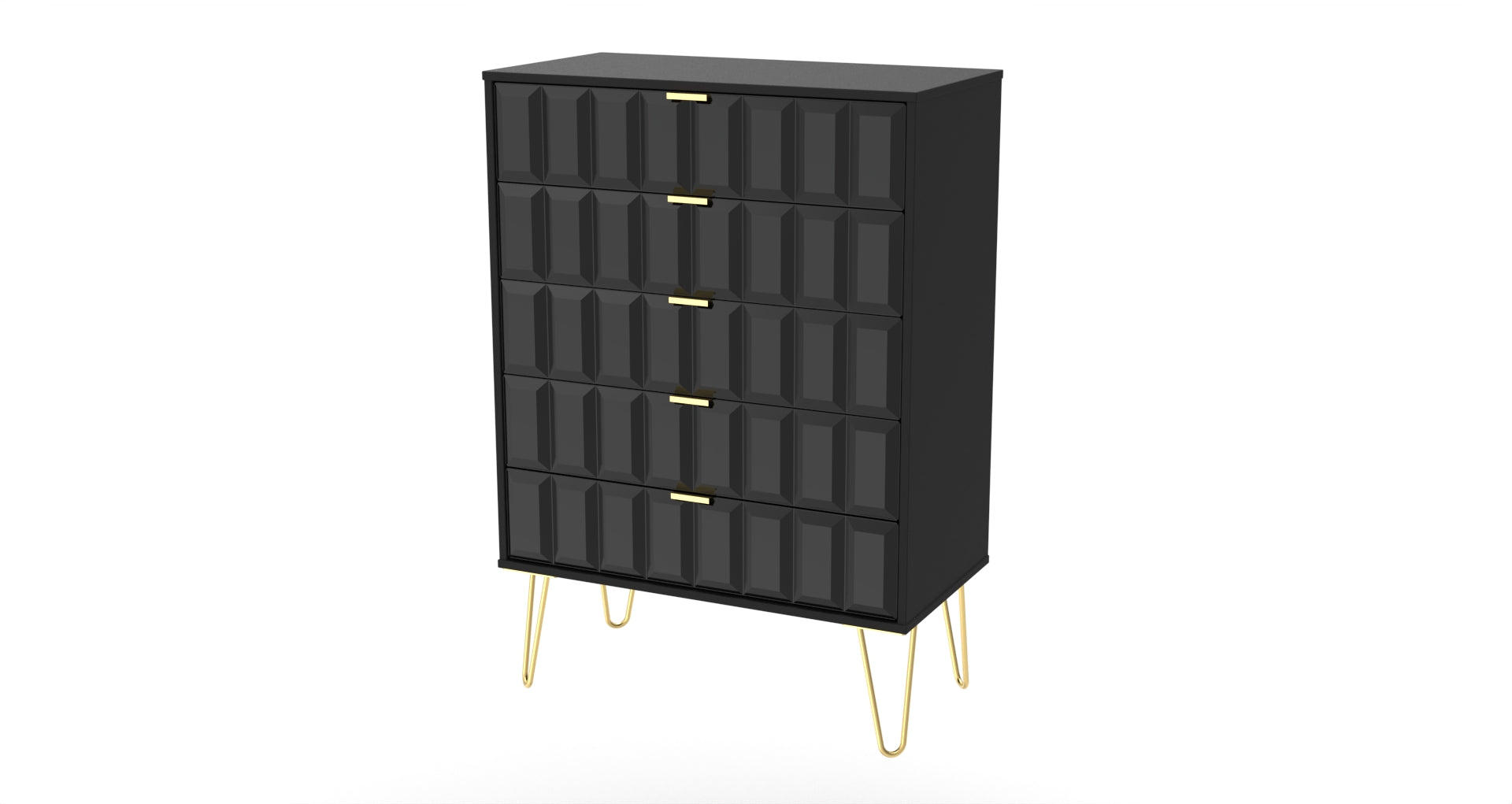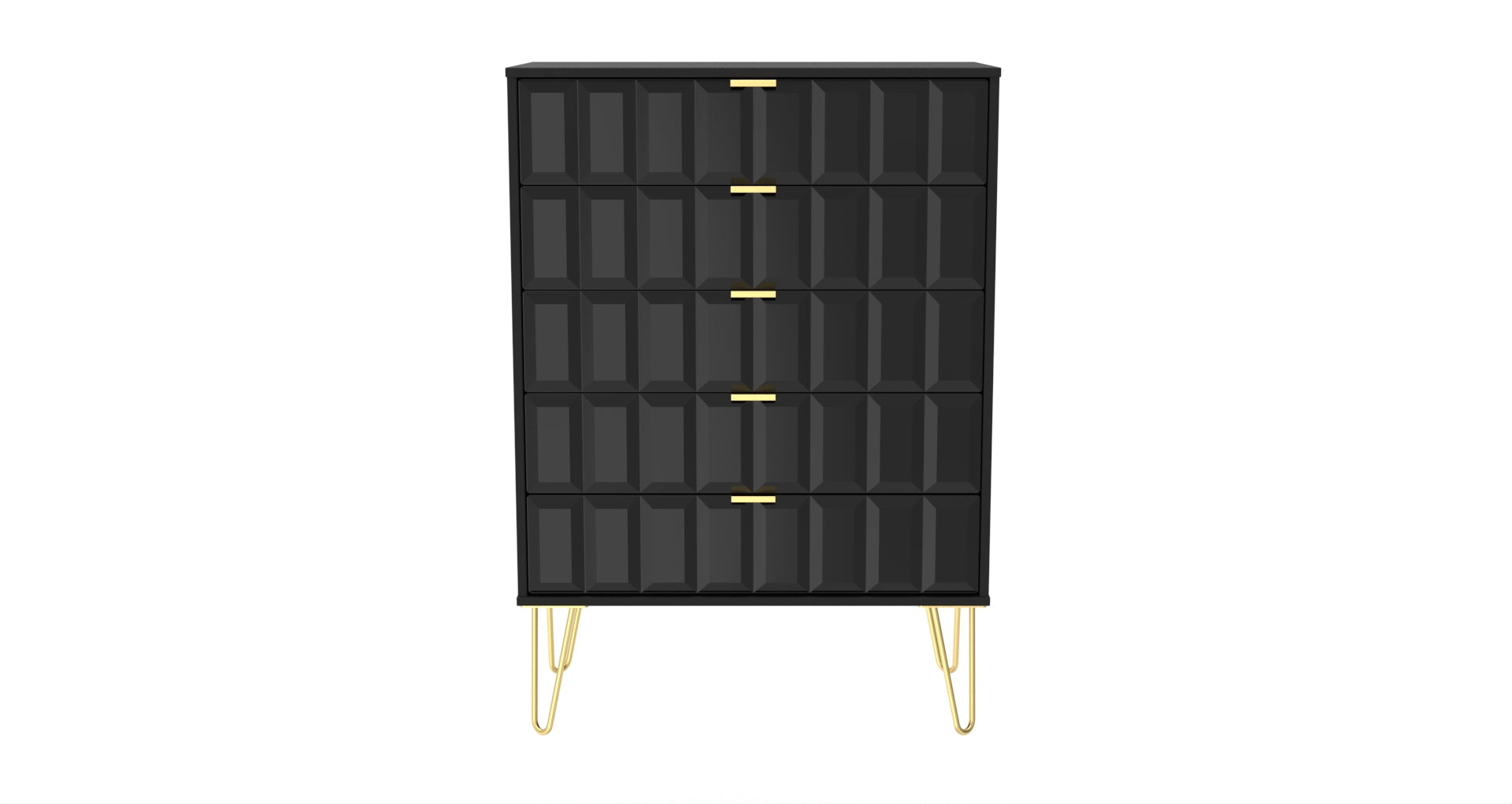 This wide 5 drawer chest of drawers is practical and stylish. Perfect for any home as a free standing storage unit. A modern and distinctive range. This ranges unique aesthetic is best represented by the distinctive "Cube" patten of the drawer and door fronts. Also features Gold Metal Handles and Gold Hairpin Legs. Comes in a wide range of colours including eye cathching two tone colour combinations. All our furniture is made to order in the United Kingdom, to the highest quality. It is delivered within 10 working days direct to your location of choice by one of our two man delivery teams, and comes fully assembled (although legs may be removed to prevent damage in transit). Part of the Cube Collection.
