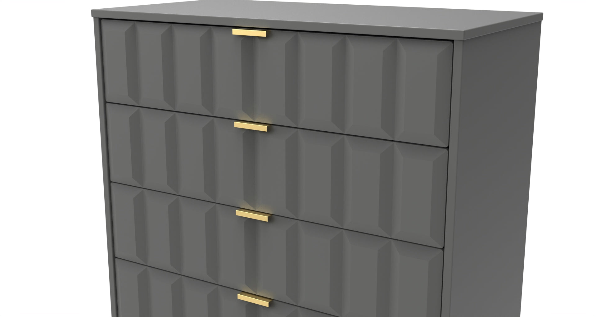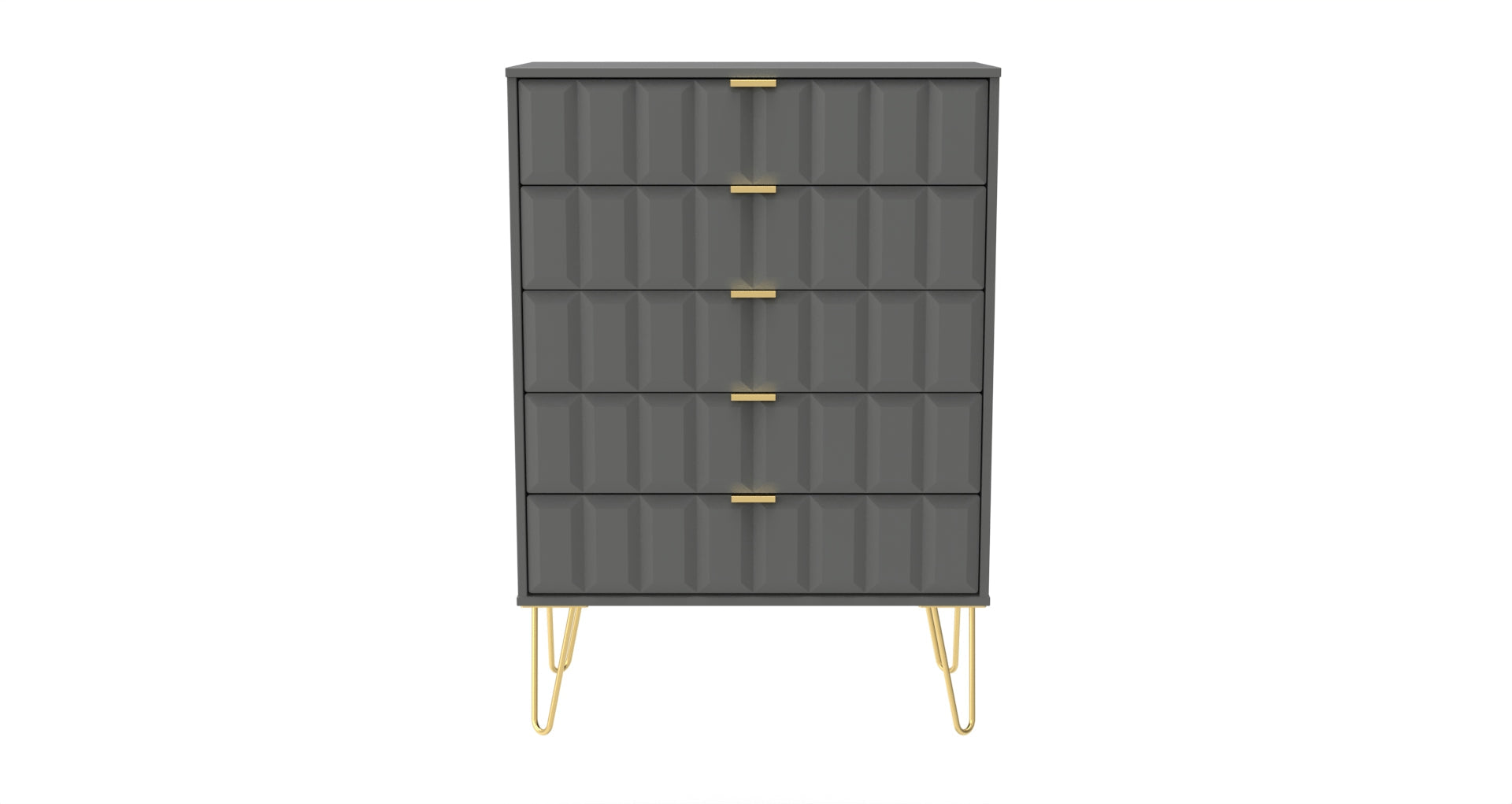 This wide 5 drawer chest of drawers is practical and stylish. Perfect for any home as a free standing storage unit. A modern and distinctive range. This ranges unique aesthetic is best represented by the distinctive "Cube" patten of the drawer and door fronts. Also features Gold Metal Handles and Gold Hairpin Legs. Comes in a wide range of colours including eye cathching two tone colour combinations. All our furniture is made to order in the United Kingdom, to the highest quality. It is delivered within 10 working days direct to your location of choice by one of our two man delivery teams, and comes fully assembled (although legs may be removed to prevent damage in transit). Part of the Cube Collection.