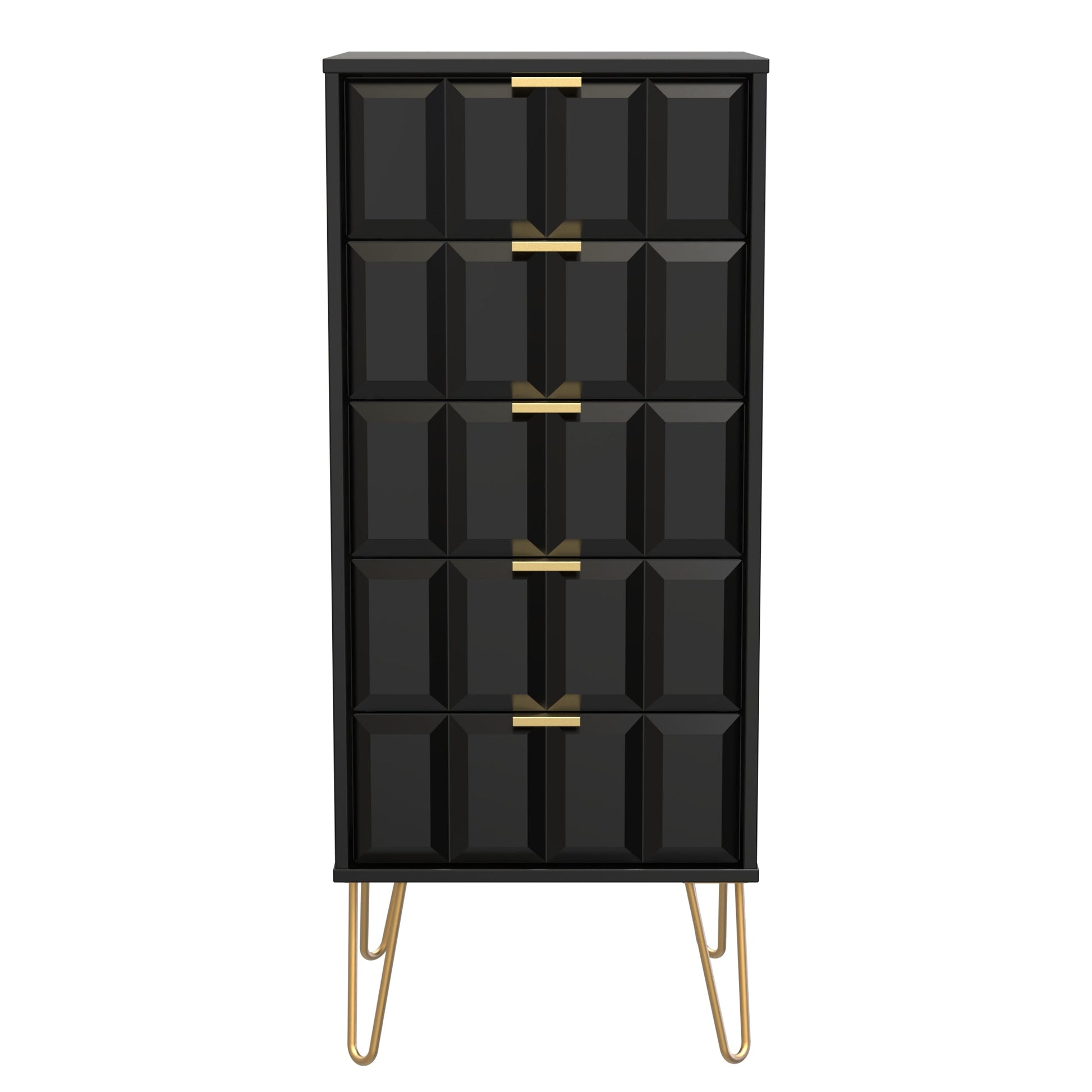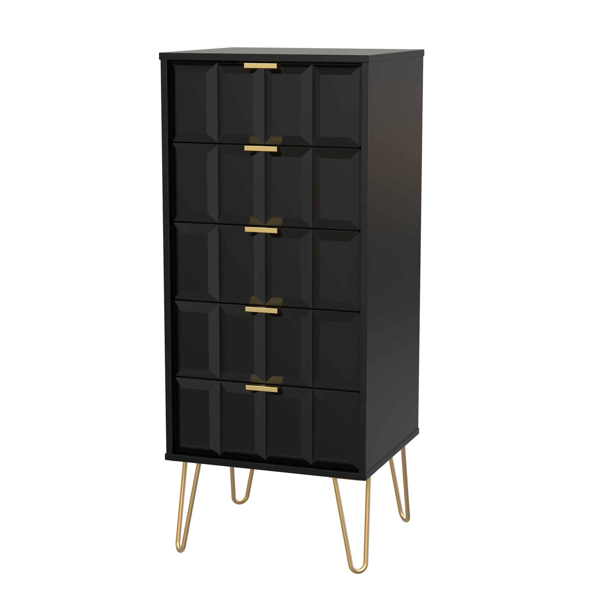 This 5 drawer chest of drawers is practical and stylish. Perfect for any home as a free standing storage unit. A modern and distinctive range. This ranges unique aesthetic is best represented by the distinctive "Cube" patten of the drawer and door fronts. Also features Gold Metal Handles and Gold Hairpin Legs. Comes in a wide range of colours including eye cathching two tone colour combinations. All our furniture is made to order in the United Kingdom, to the highest quality. It is delivered within 10 working days direct to your location of choice by one of our two man delivery teams, and comes fully assembled (although legs may be removed to prevent damage in transit). Part of the Cube Collection.