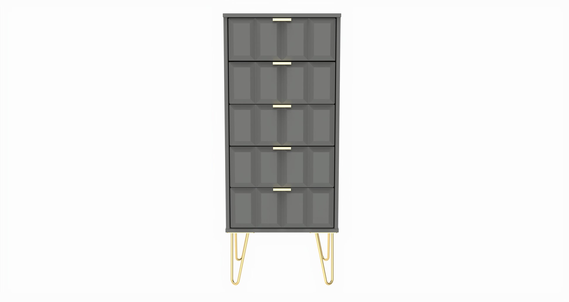 This 5 drawer chest of drawers is practical and stylish. Perfect for any home as a free standing storage unit. A modern and distinctive range. This ranges unique aesthetic is best represented by the distinctive "Cube" patten of the drawer and door fronts. Also features Gold Metal Handles and Gold Hairpin Legs. Comes in a wide range of colours including eye cathching two tone colour combinations. All our furniture is made to order in the United Kingdom, to the highest quality. It is delivered within 10 working days direct to your location of choice by one of our two man delivery teams, and comes fully assembled (although legs may be removed to prevent damage in transit). Part of the Cube Collection.