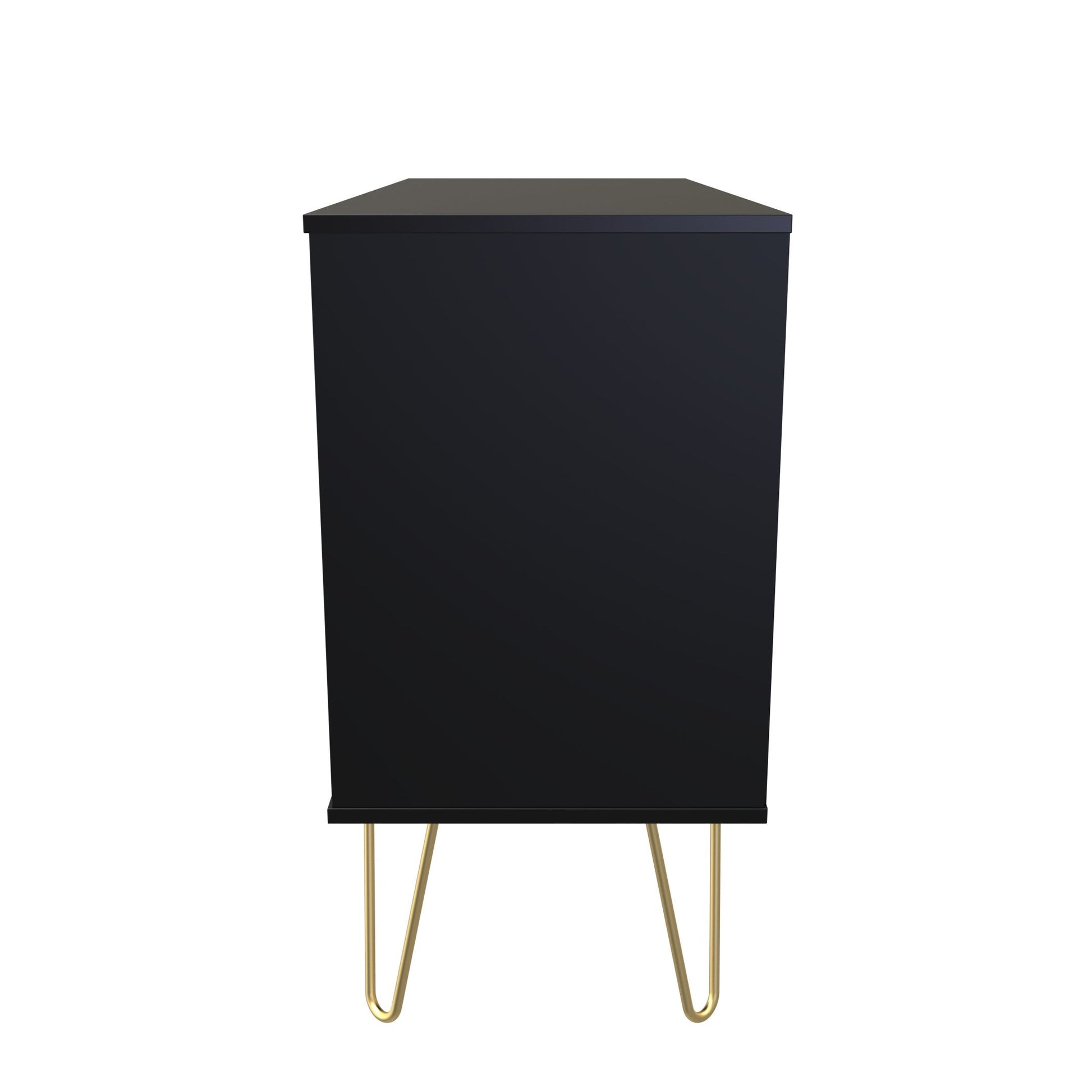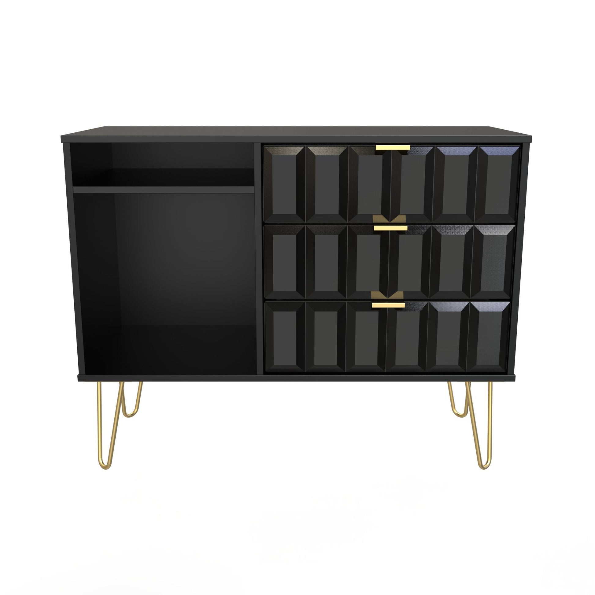 This modern storage unit features 3 drawers and a large storage area with a single shelf. Can be used as a TV/Media unit or sideboard. A modern and distinctive range. This ranges unique aesthetic is best represented by the distinctive "Cube" patten of the drawer and door fronts. Also features Gold Metal Handles and Gold Hairpin Legs. Comes in a wide range of colours including eye cathching two tone colour combinations. All our furniture is made to order in the United Kingdom, to the highest quality. It is delivered within 10 working days direct to your location of choice by one of our two man delivery teams, and comes fully assembled (although legs may be removed to prevent damage in transit). Part of the Cube Collection.
