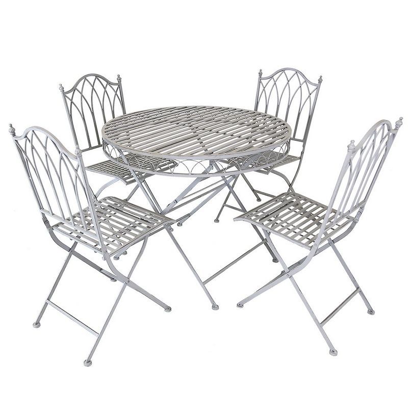 This cleverly designed bistro set is beautiful in its simplicity and an ideal choice if you are shopping for exceptional value without compromise on product quality. Ideal for those who love spending time outdoors and want a garden that will wow guests.The Deco collection will effortlessly complement any garden with a sleek design and durable build.This bistro set is perfect for creating a dining space within a smaller section of your garden, terrace or balcony. A flexible and stylish addition to any outdoor space. The biggest advantage of metal outdoor furniture is that its incredibly durable. As an especially robust material, unlike plastic, metal makes a great choice for patio furnishings, since you wont need to replace it too often as long as its well cared for. Itll stay looking great on the decking for years to come. You and 3 others will be able to relax, enjoy snacks, and chat in the sunshine.This stylish bistro set will suit perfectly in your garden, patio or deck, adding a touch of distinction to your outdoor area. This set is so elegant that you'll have every guest asking you about them. For your comfort the chairs are fully foldable, so they don't take up much space when not needed. The antirust finish on this garden bistro set guarantees a long lifespan, helping it withstand all outdoor weather conditions.Product SpecificationProduct Type: Bistro SetMaterial: Wrought IronColour: GreyPattern / Finish: PaintedNumber Of Seats: 4Seat Style: PatioPadded Seat: Not ApplicableCushion Colour: Not ApplicableCushion Pattern: Not ApplicableTable Shape: CircleGlass Table Top: NoParasol Included: NoAssembly Required: YesAdditional featuresIncludes: 4 Seater Bistro / Dining setMaterials: Wrought IronDimensions: Chair: H93 x D53 x W43cmTable: H74 x Dia.90cmHeight from chair seat to floor:43cmWeights: Table: 19kg1 Chair: 6kgChair maximum user weight:110kgColour: GreySome self-assembly required. Full instructions provided.Aftercare instructions includedLifestyle images and accessories shown are for illustration purposes only.