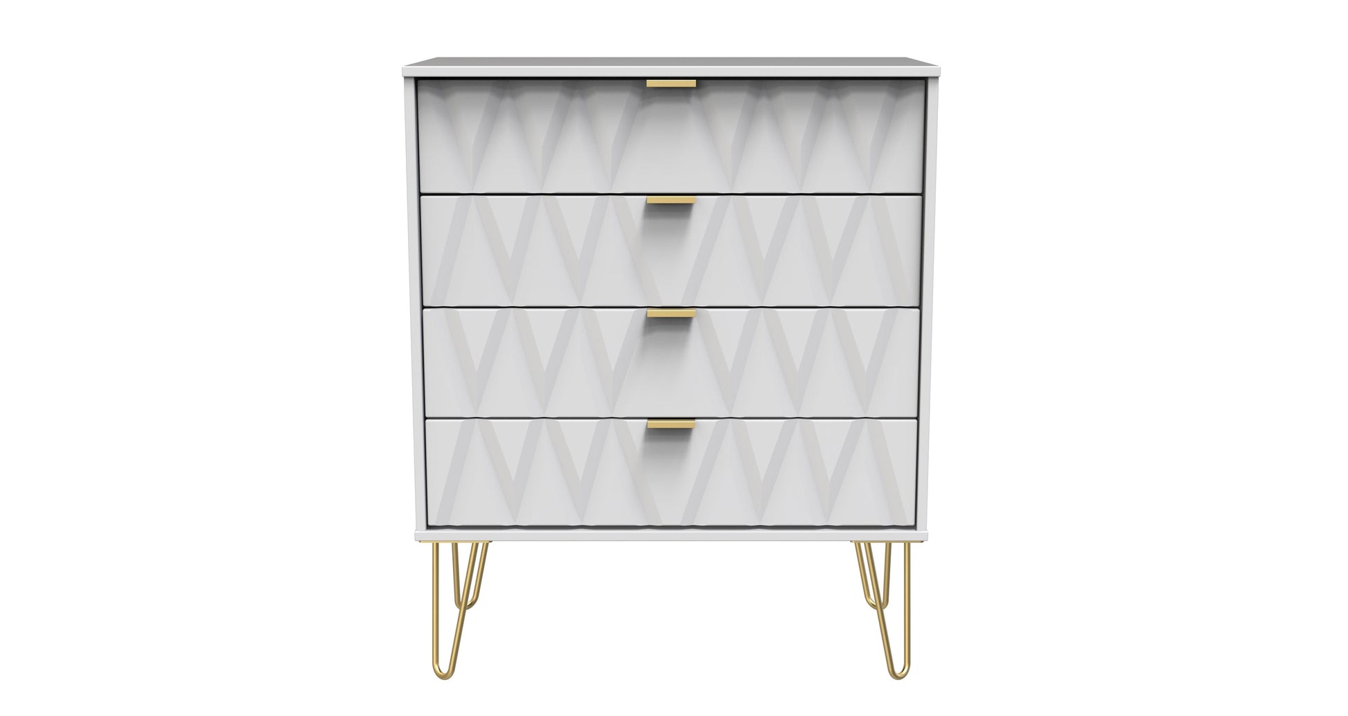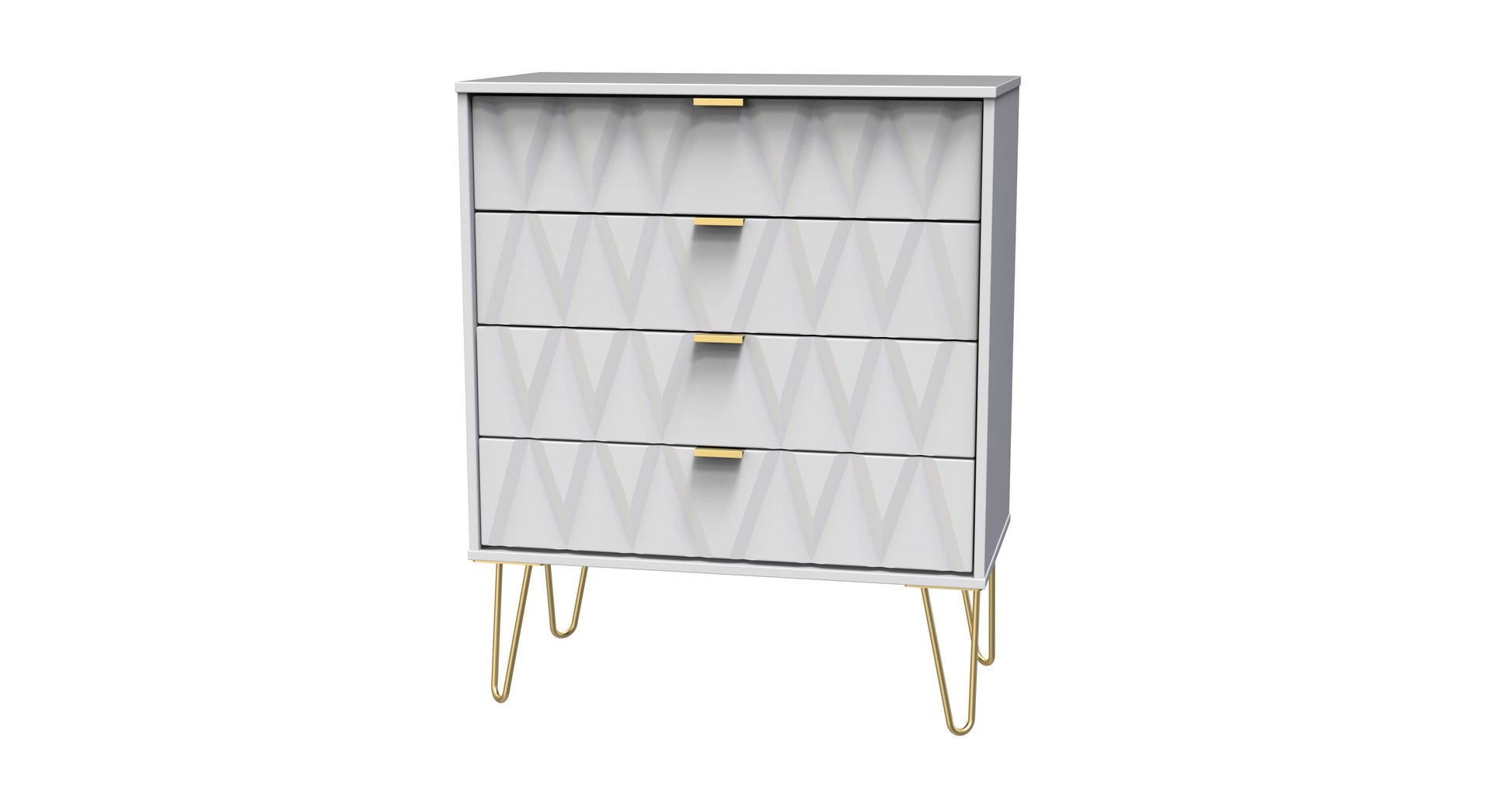 This wide 4 drawer chest of drawers is practical and stylish. Perfect for any home as a free standing storage unit. Say hello to contemporary cool with this modern range, with distinctive patterned drawers and a variety of colour options available to compliment any interior design. Gold metal handles and sturdy hairpin legs complete the storage solution. All our furniture is made to order in the United Kingdom, to the highest quality. It is delivered within 10 working days direct to your location of choice by one of our two man delivery teams, and comes fully assembled (although legs may be removed to prevent damage in transit). Part of the Diamond Collection.