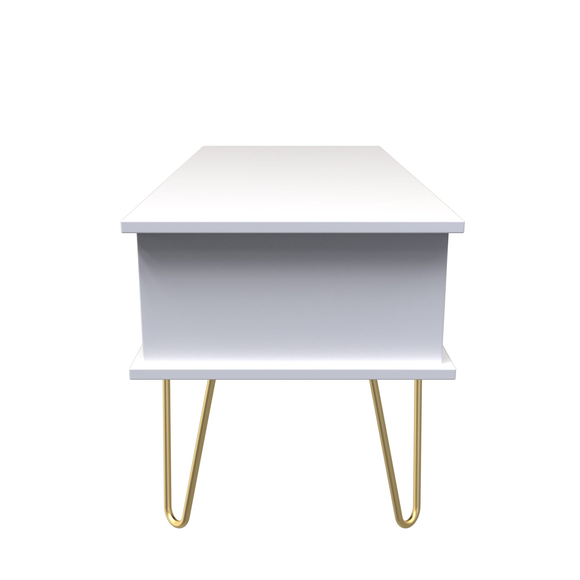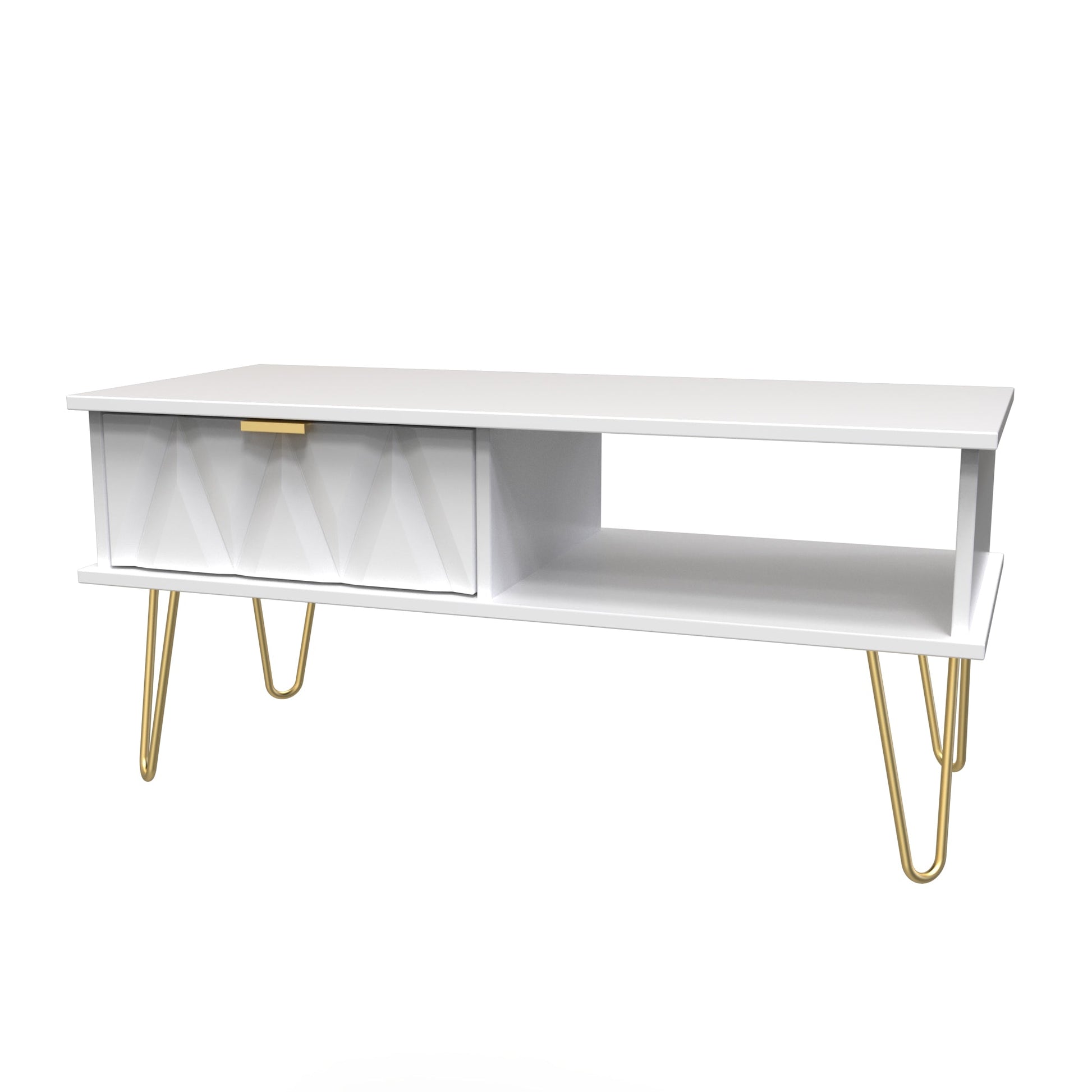 This modern coffee table, has a single storage drawer and open shelf stroage area. Say hello to contemporary cool with this modern range, with distinctive patterned drawers and a variety of colour options available to compliment any interior design. Gold metal handles and sturdy hairpin legs complete the storage solution. All our furniture is made to order in the United Kingdom, to the highest quality. It is delivered within 10 working days direct to your location of choice by one of our two man delivery teams, and comes fully assembled (although legs may be removed to prevent damage in transit). Part of the Diamond Collection.