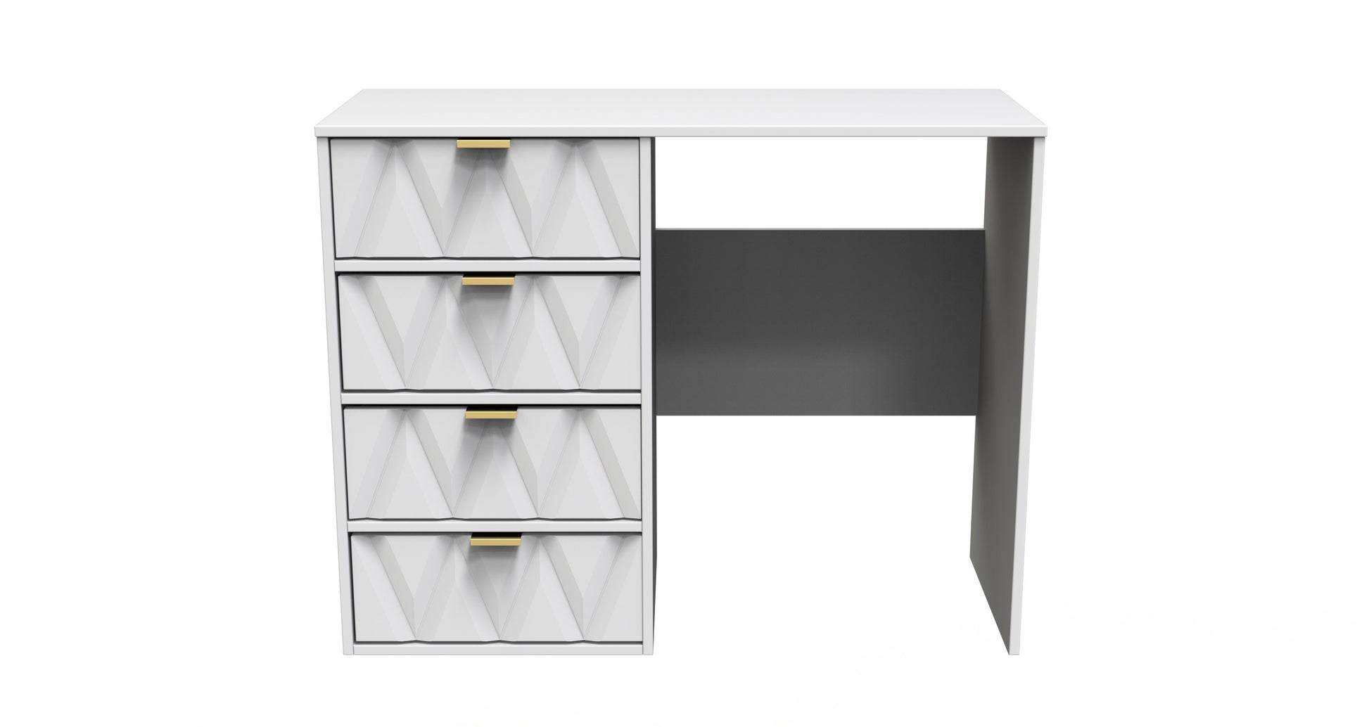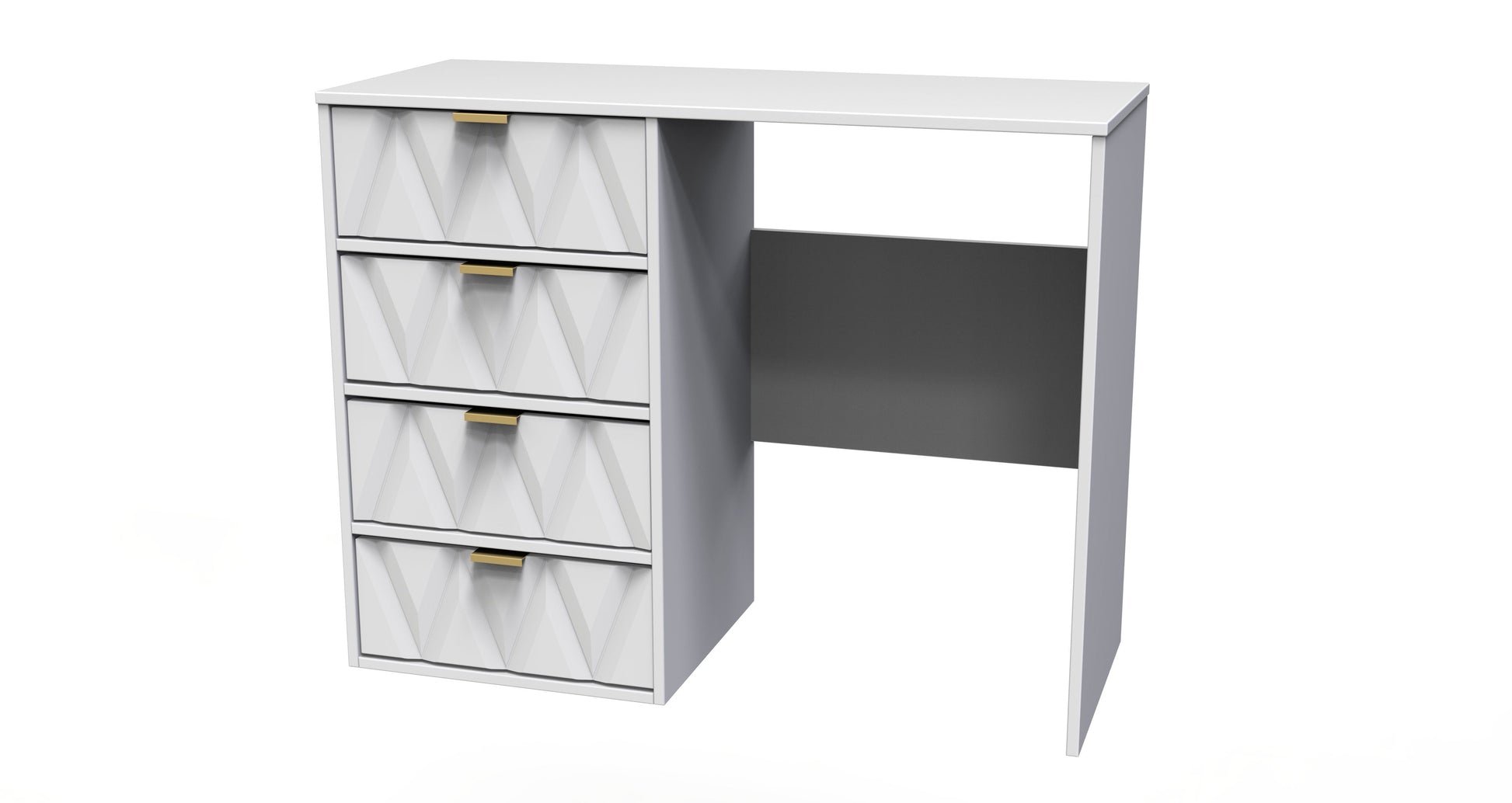 This 4 Drawer Vanity/Desk is equally at home in the bedroom or the office. Say hello to contemporary cool with this modern range, with distinctive patterned drawers and a variety of colour options available to compliment any interior design. Gold metal handles and sturdy hairpin legs complete the storage solution. All our furniture is made to order in the United Kingdom, to the highest quality. It is delivered within 10 working days direct to your location of choice by one of our two man delivery teams, and comes fully assembled (although legs may be removed to prevent damage in transit). Part of the Diamond Collection.
