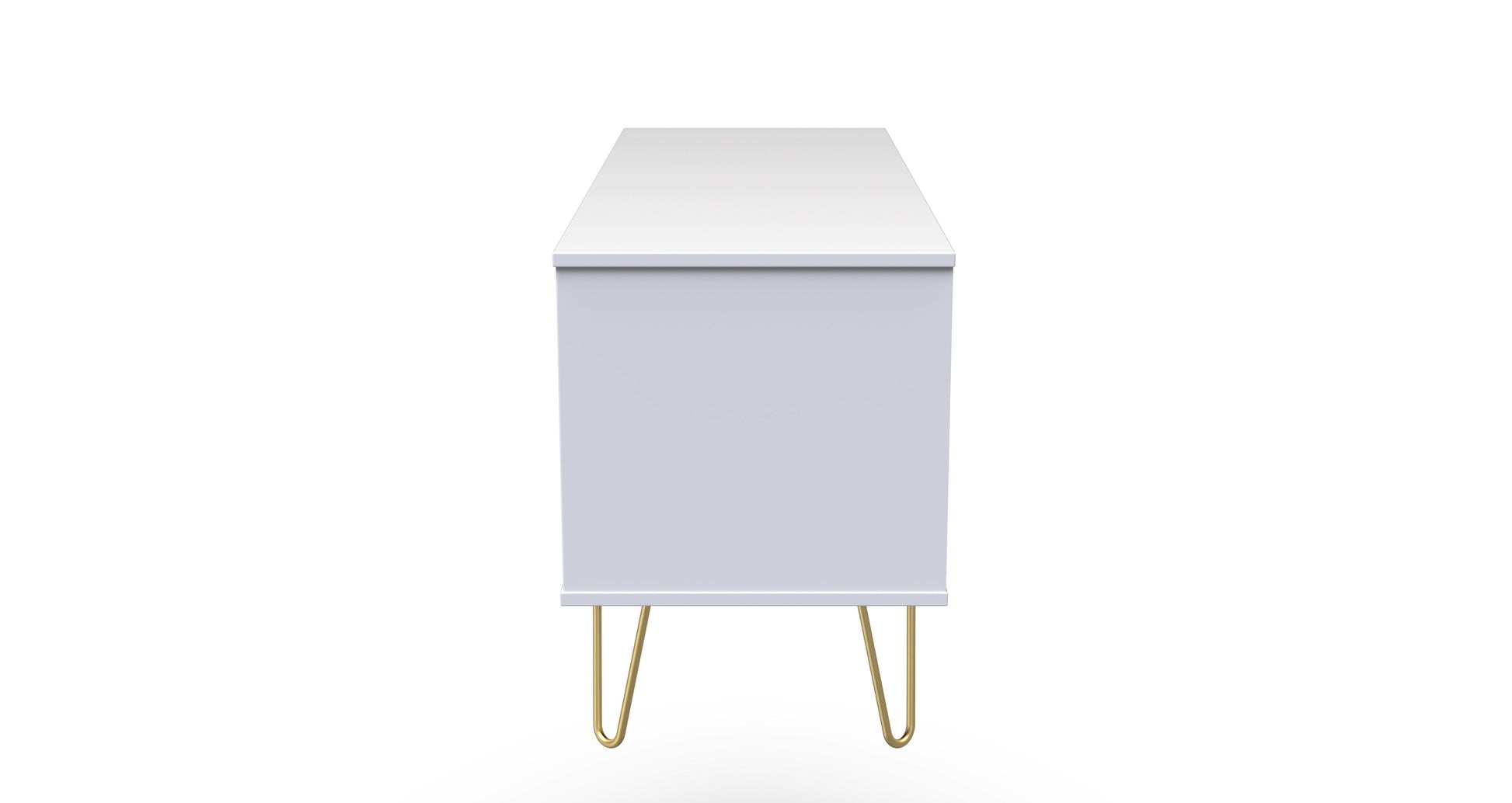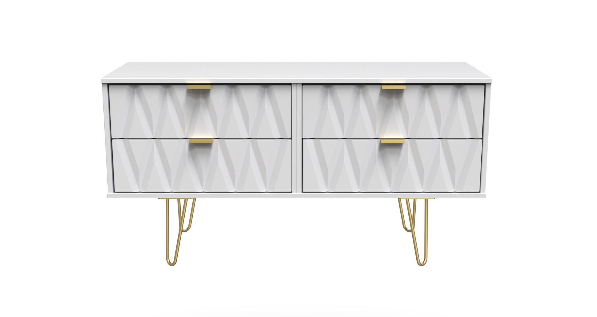 A large 4 drawer bed box. A Perfect storage solution for any room (not just the end of your bed). Could also be used as a low level TV/Media stand. Say hello to contemporary cool with this modern range, with distinctive patterned drawers and a variety of colour options available to compliment any interior design. Gold metal handles and sturdy hairpin legs complete the storage solution. All our furniture is made to order in the United Kingdom, to the highest quality. It is delivered within 10 working days direct to your location of choice by one of our two man delivery teams, and comes fully assembled (although legs may be removed to prevent damage in transit). Part of the Diamond Collection.