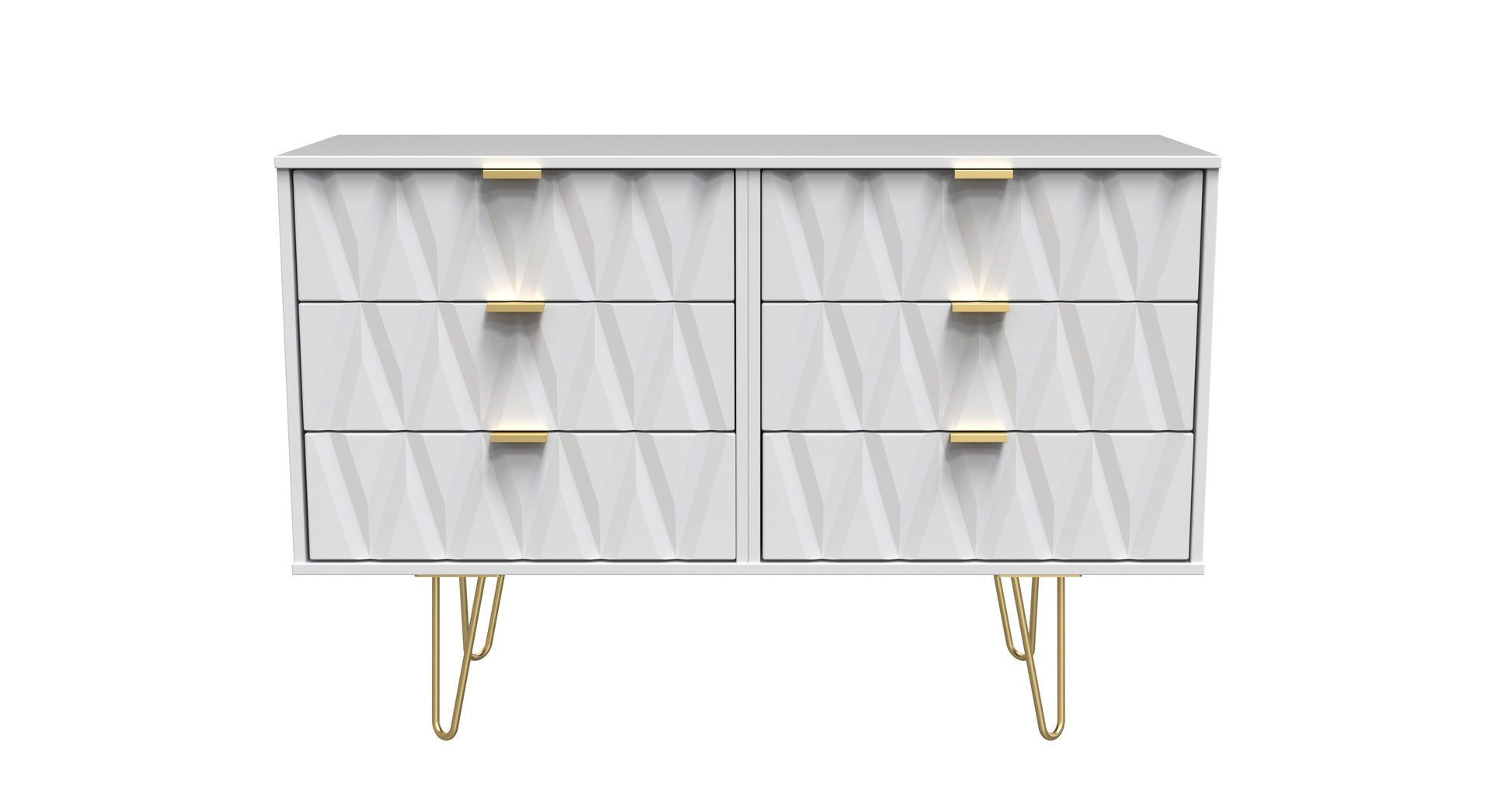 This double width 6 drawer chest of drawers is practical and stylish. Perfect for any home as a free standing storage unit. Say hello to contemporary cool with this modern range, with distinctive patterned drawers and a variety of colour options available to compliment any interior design. Gold metal handles and sturdy hairpin legs complete the storage solution. All our furniture is made to order in the United Kingdom, to the highest quality. It is delivered within 10 working days direct to your location of choice by one of our two man delivery teams, and comes fully assembled (although legs may be removed to prevent damage in transit). Part of the Diamond Collection.