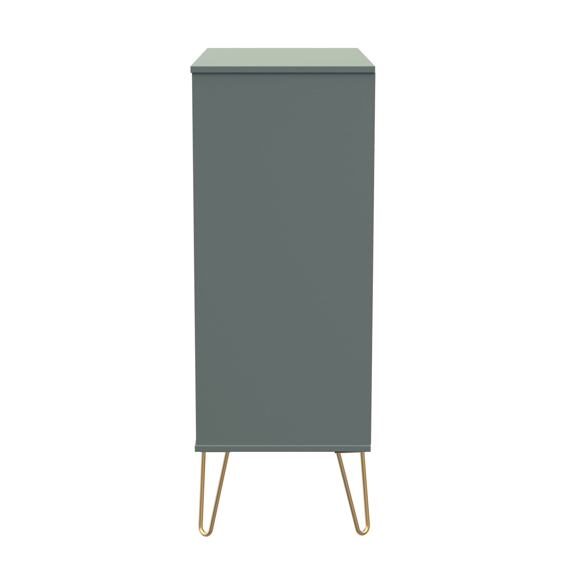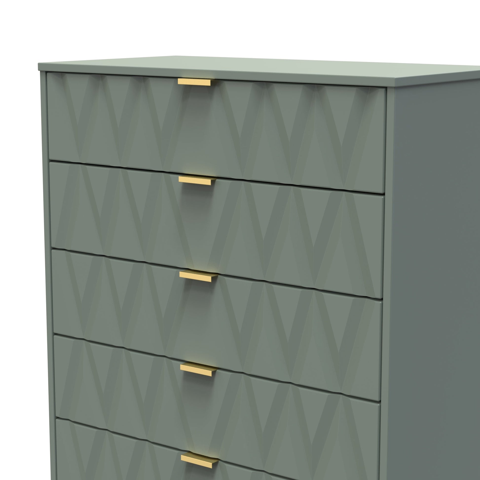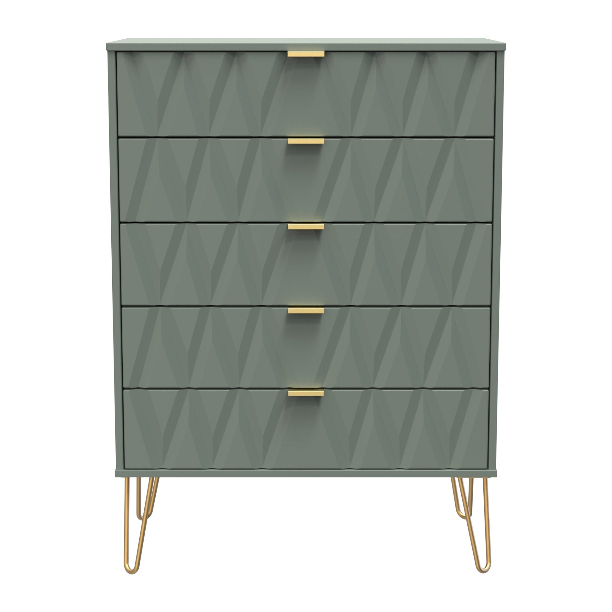 This wide 5 drawer chest of drawers is practical and stylish. Perfect for any home as a free standing storage unit. Say hello to contemporary cool with this modern range, with distinctive patterned drawers and a variety of colour options available to compliment any interior design. Gold metal handles and sturdy hairpin legs complete the storage solution. All our furniture is made to order in the United Kingdom, to the highest quality. It is delivered within 10 working days direct to your location of choice by one of our two man delivery teams, and comes fully assembled (although legs may be removed to prevent damage in transit). Part of the Diamond Collection.