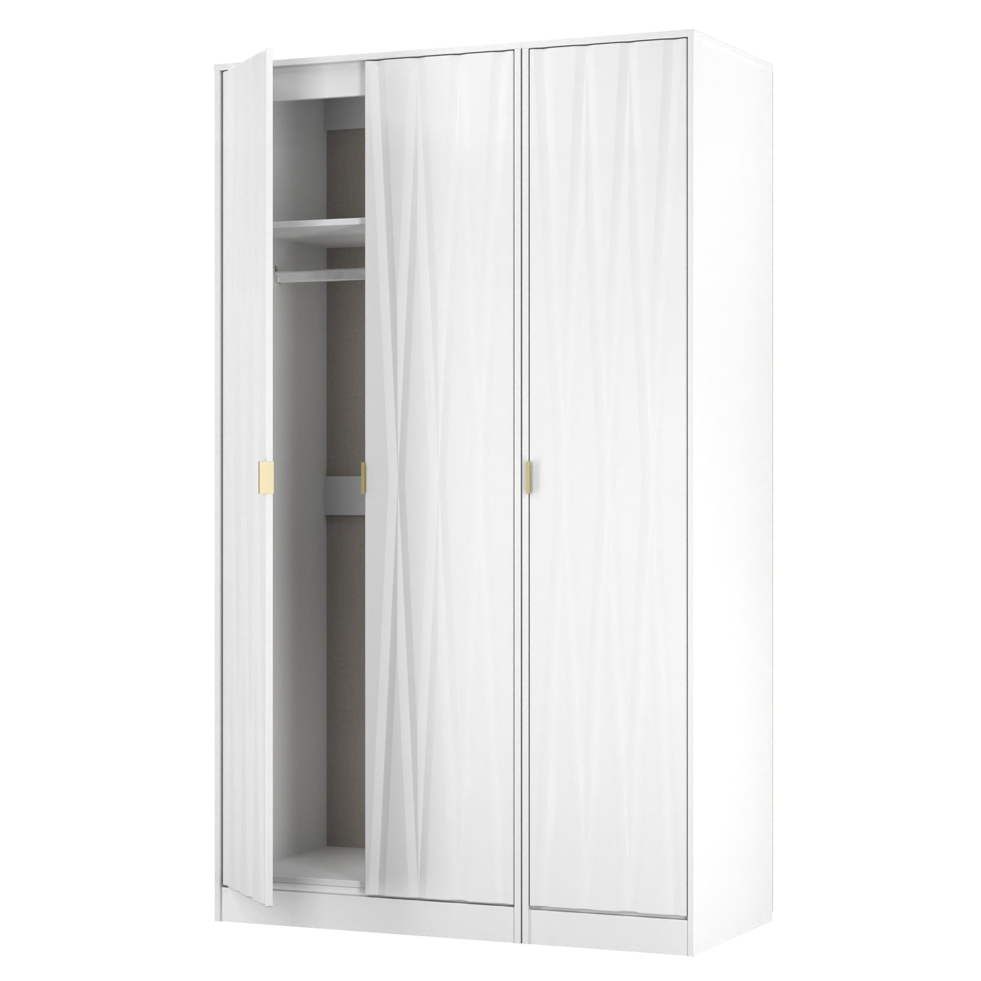 This tall triple 3 door wardrobe is perfect for any bedroom when a normal wardrobe is just not large enough. Say hello to contemporary cool with this modern range, with distinctive patterned drawers and a variety of colour options available to compliment any interior design. Gold metal handles and sturdy hairpin legs complete the storage solution. All our furniture is made to order in the United Kingdom, to the highest quality. It is delivered within 10 working days direct to your location of choice by one of our two man delivery teams, and comes fully assembled (although legs may be removed to prevent damage in transit). Part of the Diamond Collection.