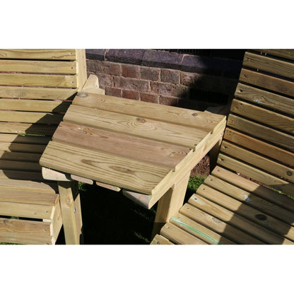 Ideal for spending time in the garden with a special friend or member of the family, the Croft 2-Seater Angled Tete a Tete has been ergonomically designed with both comfort and style in mind. The seats come with a handy little tray that rests on the arms connecting them together. The tray lifts on and off with ease allowing you the freedom to relocate the chairs easily in your garden. This furniture set complements all the garden pieces and sets in the same or similar ranges. Made with responsibly-sourced timber and pressure treated for greater durability. Constructed with rust-resistant galvanised zinc bolts. A product proudly made in Great Britain. This set comes delivered fully assembled on a wooden pallet.