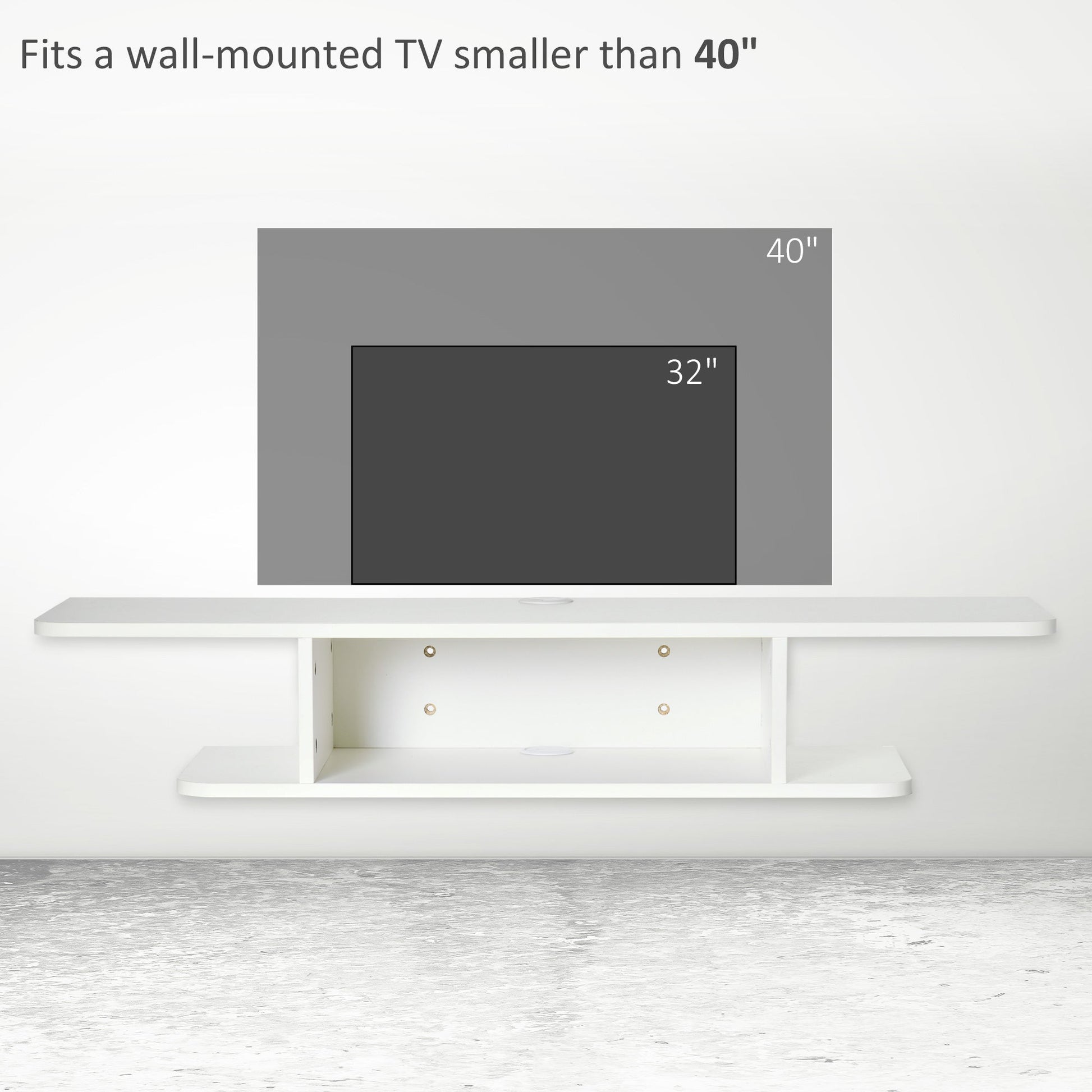 Make your space modern with this floating TV shelf, from HOMCOM. The wall-mounted design means no floor space is taken, with cable holes on the back to keep wires together and mess-free. Made from particle board, this unit is durable, with a protective melamine coating. It has a spacious middle shelf for storage; the smaller side shelves and table top offer extra display room.