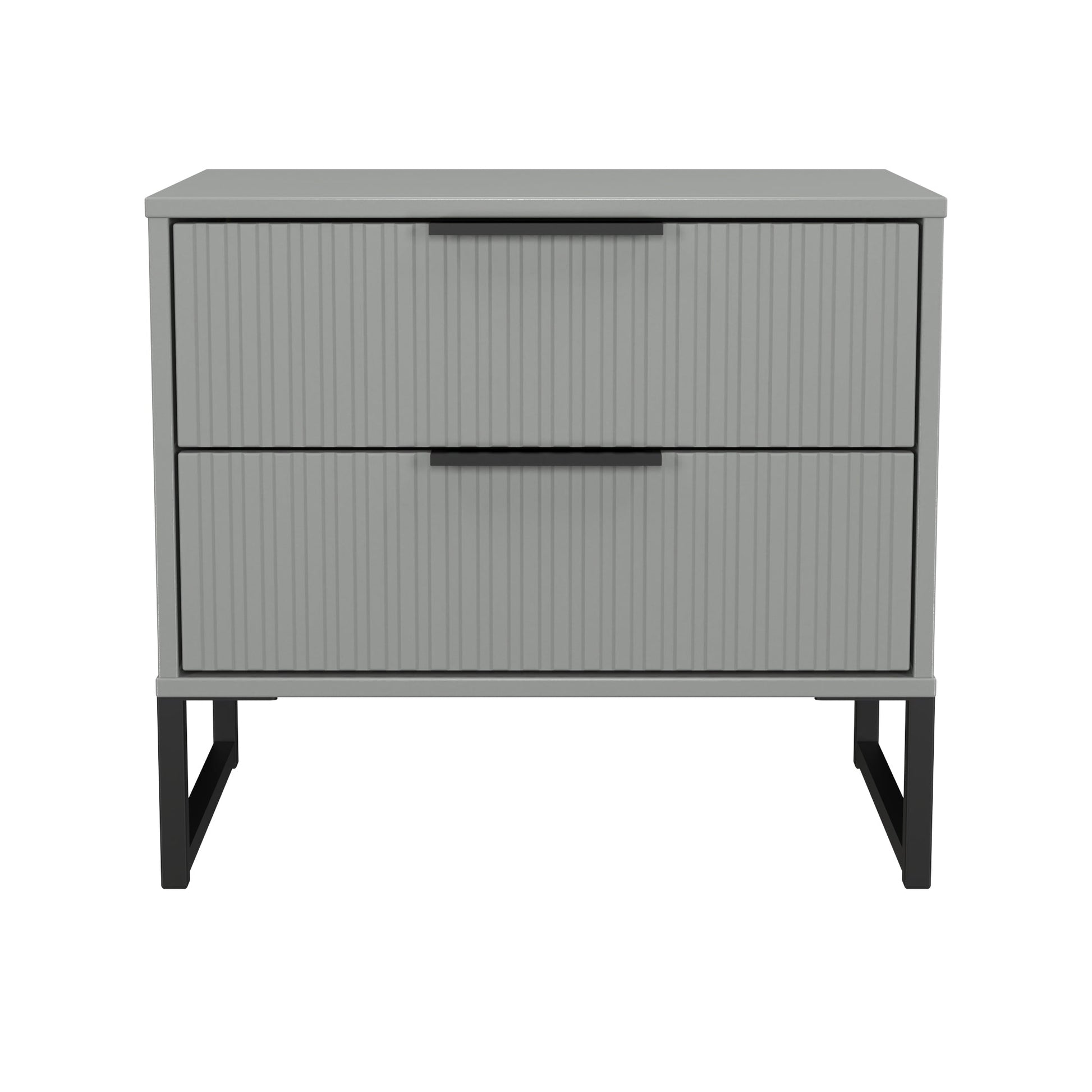 This 2 drawer bedside cabinet is wider than normal for added practicality. Perfect for any bedside or as a free standing storage unit. A new stand out range, with its new deep cut "fluted" grove patten of the drawer and door fronts. Featuring black metal handles and black sleigh legs. A striking and individual range that is perfect for the modern home. All our furniture is made to order in the United Kingdom, to the highest quality using responsibly sourced materials. It is delivered within 10 working days direct to your location of choice by one of our two man delivery teams, and comes fully assembled (although items with legs will have those legs removed during transit to avoid damage). Part of the Fluted Collection.