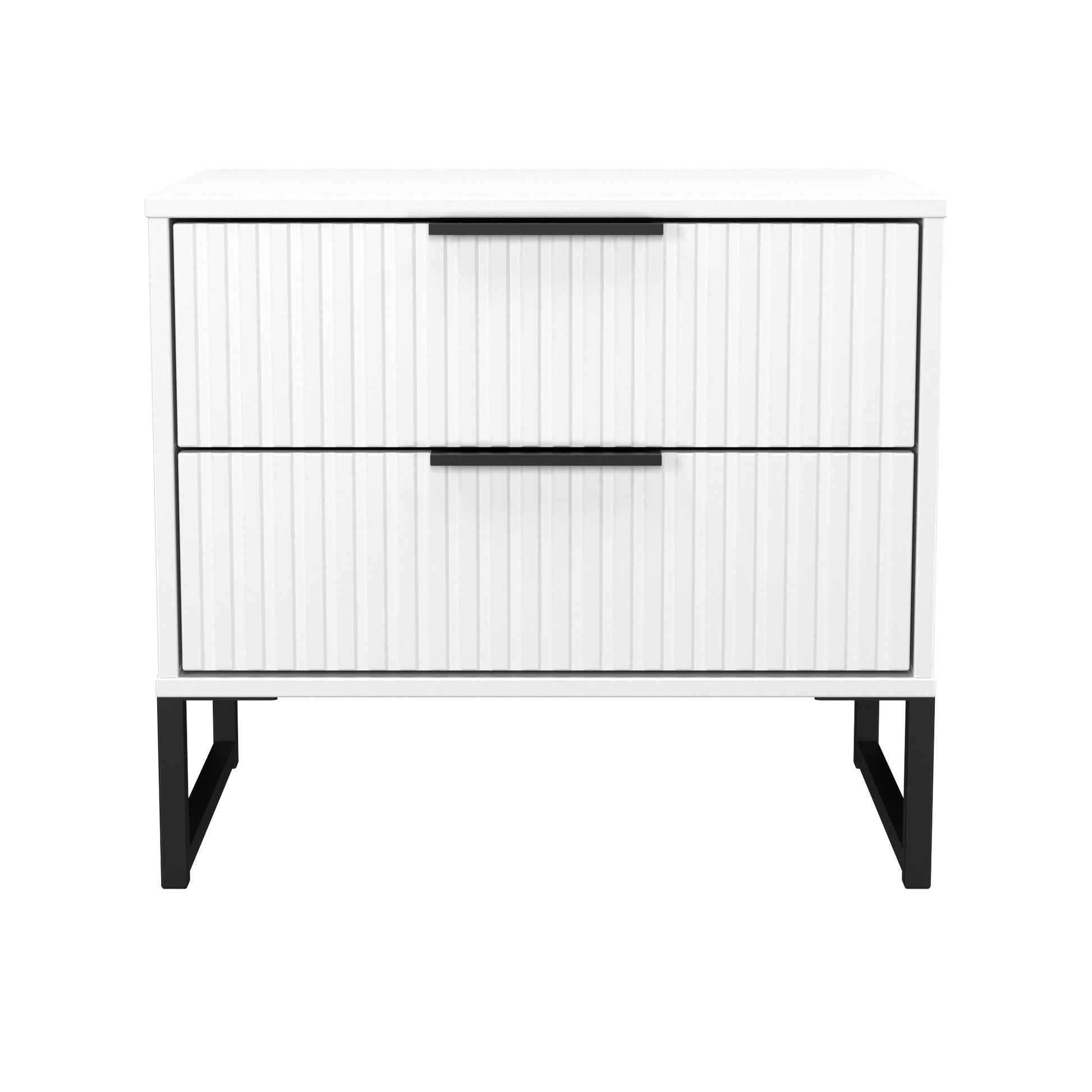 This 2 drawer bedside cabinet is wider than normal for added practicality. Perfect for any bedside or as a free standing storage unit. A new stand out range, with its new deep cut "fluted" grove patten of the drawer and door fronts. Featuring black metal handles and black sleigh legs. A striking and individual range that is perfect for the modern home. All our furniture is made to order in the United Kingdom, to the highest quality using responsibly sourced materials. It is delivered within 10 working days direct to your location of choice by one of our two man delivery teams, and comes fully assembled (although items with legs will have those legs removed during transit to avoid damage). Part of the Fluted Collection.