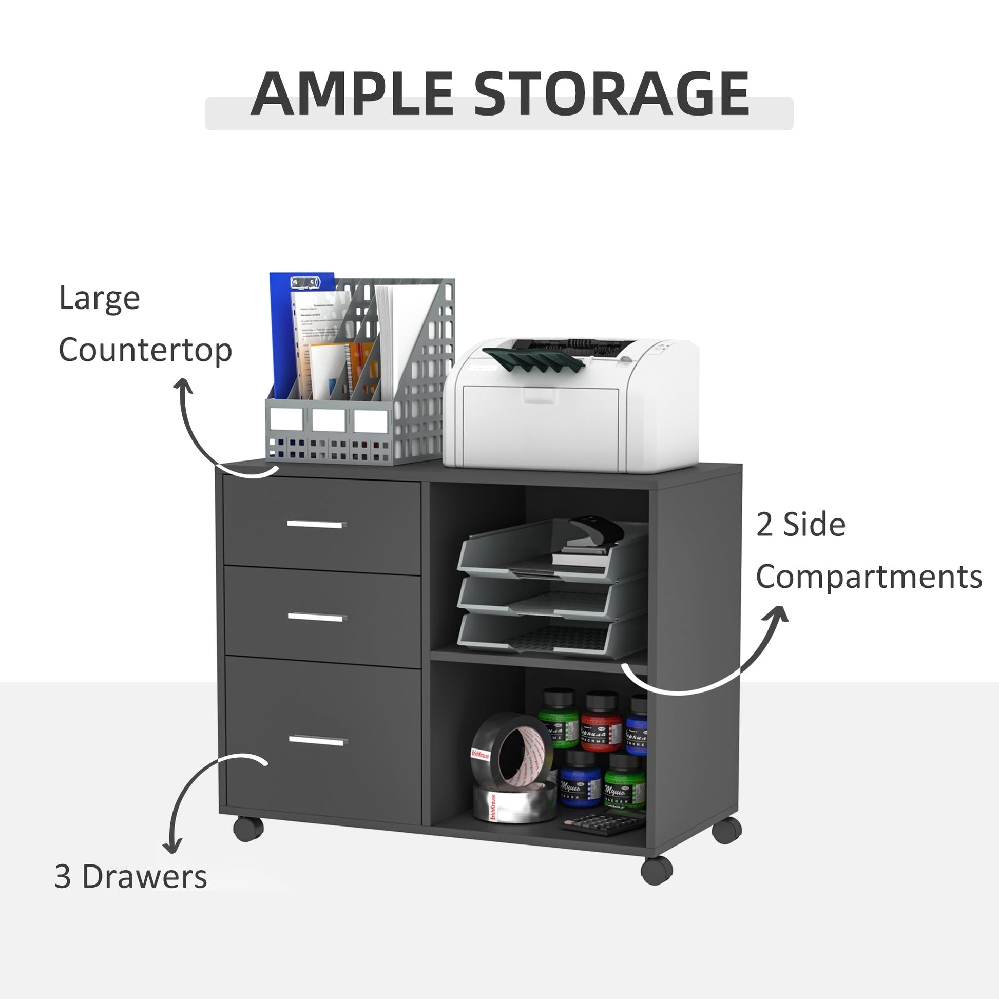 Give your office style and storage all at once with this cabinet from HOMCOM. It features two open compartments and three drawers, giving you plenty of space to keep files, folders and stationary organized. The shelf on the right can be adjusted to suit your needs. Four castor wheels ensure easy movement, with two lockable to keep stationary. It's made from particle board, ensuring it is tough and durable for everyday use, in a black colour for a sleek addition which sits well-placed anywhere.