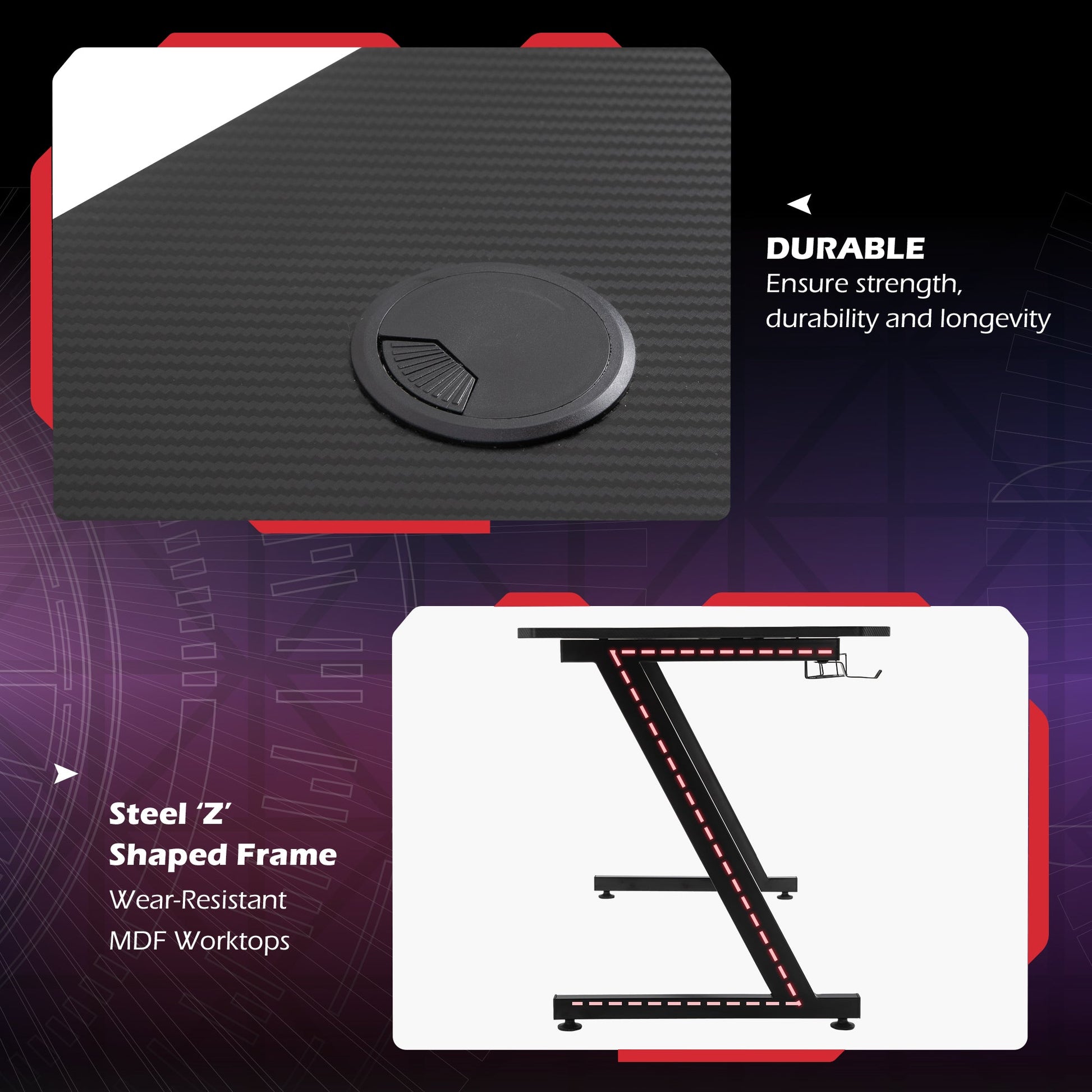 Transform your gaming time with this PC desk for gaming from HOMCOM. Made from particle board for a durable and reliable structure, the gamer desk features a large main worktop, a cup holder and a hanging hook, giving you everything you need to keep everything together. Steel legs keep the balance in check, and adjustable feet ensure this desk will be balanced even on unsteady ground. It's finished with a cable organiser on the back so the wires keep untangled and out of your way.
