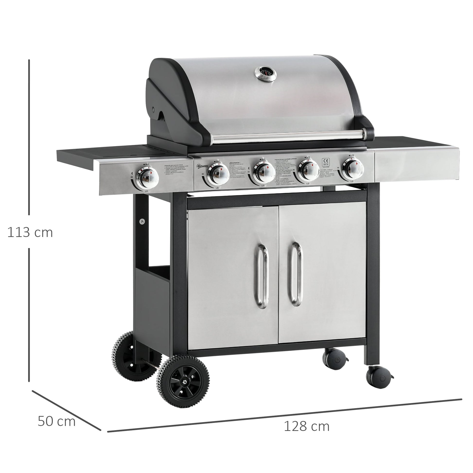 Gas Barbecue Grill 4+1 Burner Garden Smoker BBQ Trolley w/ Side Burner Warming Rack Side Shelves Storage Cabinet Piezo Ignition Thermometer Stainless Steel + Metal