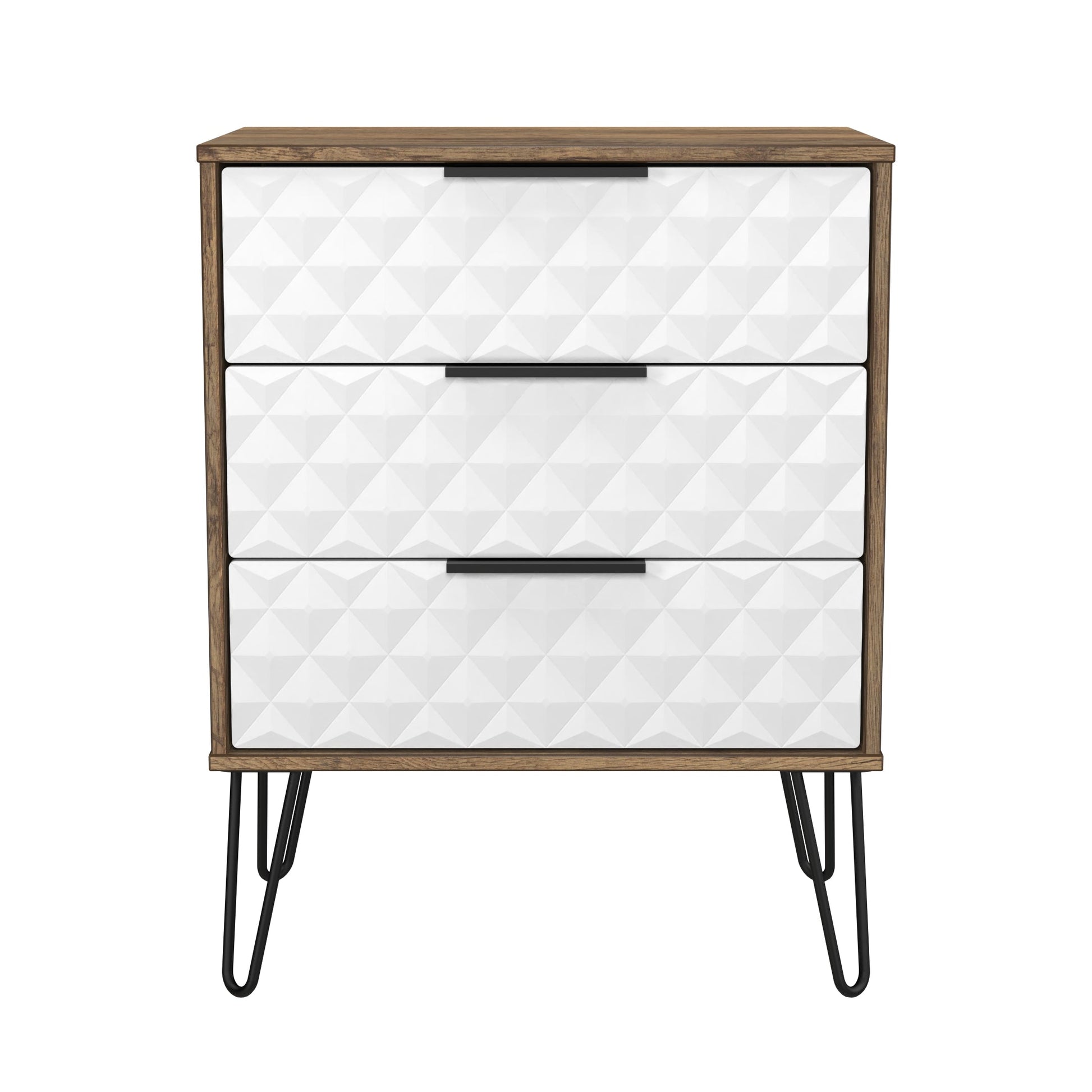 This 3 drawer bedside cabinet is wider than normal for added practicality. Perfect for any bedside or as a free standing storage unit. A modern and distinctive range. This ranges unique aesthetic is best represented by the distinctive "Harlequin" patten of the drawer and door fronts. Also features Black Metal Handles and Black Hairpin Legs. Comes in a wide range of colours including eye cathching two tone colour combinations. All our furniture is made to order in the United Kingdom, to the highest quality using responsibly sourced materials. It is delivered within 10 working days direct to your location of choice by one of our two man delivery teams, and comes fully assembled (although items with legs will have those legs removed during transit to avoid damage). Part of the Harlequin Collection.