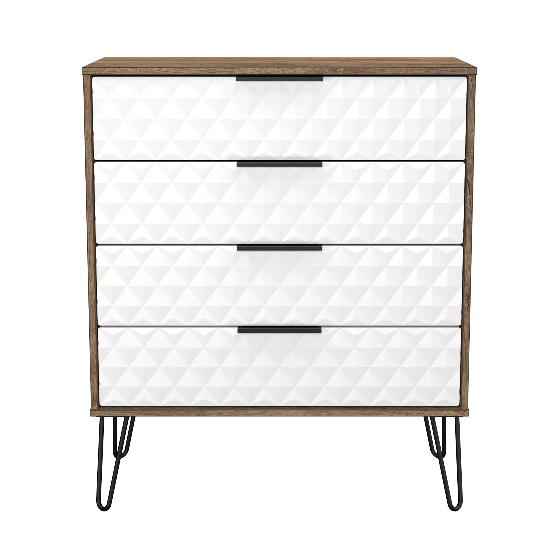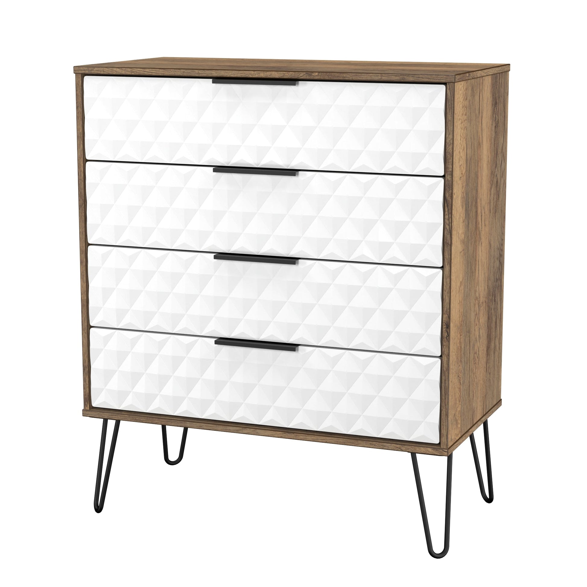 This wide 4 drawer chest of drawers is practical and stylish. Perfect for any home as a free standing storage unit. A modern and distinctive range. This ranges unique aesthetic is best represented by the distinctive "Harlequin" patten of the drawer and door fronts. Also features Black Metal Handles and Black Hairpin Legs. Comes in a wide range of colours including eye cathching two tone colour combinations. All our furniture is made to order in the United Kingdom, to the highest quality using responsibly sourced materials. It is delivered within 10 working days direct to your location of choice by one of our two man delivery teams, and comes fully assembled (although items with legs will have those legs removed during transit to avoid damage). Part of the Harlequin Collection.