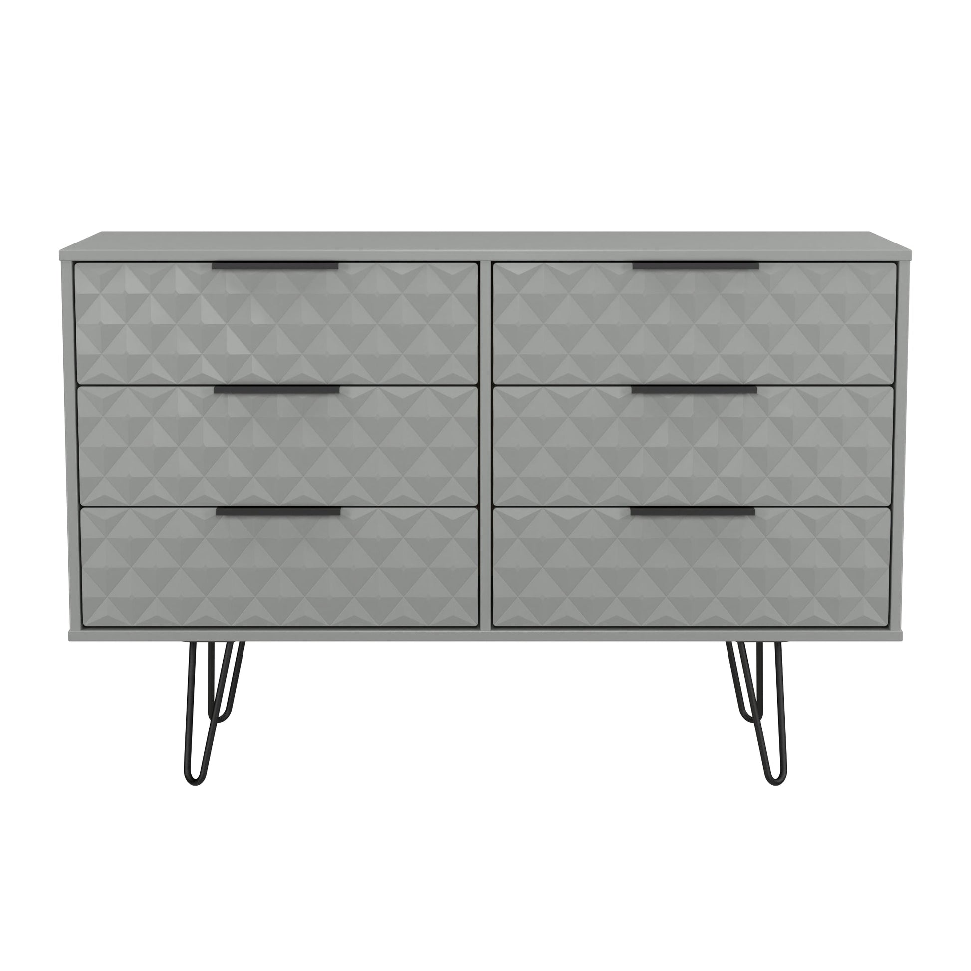 This double width 6 drawer chest of drawers is practical and stylish. Perfect for any home as a free standing storage unit. A modern and distinctive range. This ranges unique aesthetic is best represented by the distinctive "Harlequin" patten of the drawer and door fronts. Also features Black Metal Handles and Black Hairpin Legs. Comes in a wide range of colours including eye cathching two tone colour combinations. All our furniture is made to order in the United Kingdom, to the highest quality using responsibly sourced materials. It is delivered within 10 working days direct to your location of choice by one of our two man delivery teams, and comes fully assembled (although items with legs will have those legs removed during transit to avoid damage). Part of the Harlequin Collection.