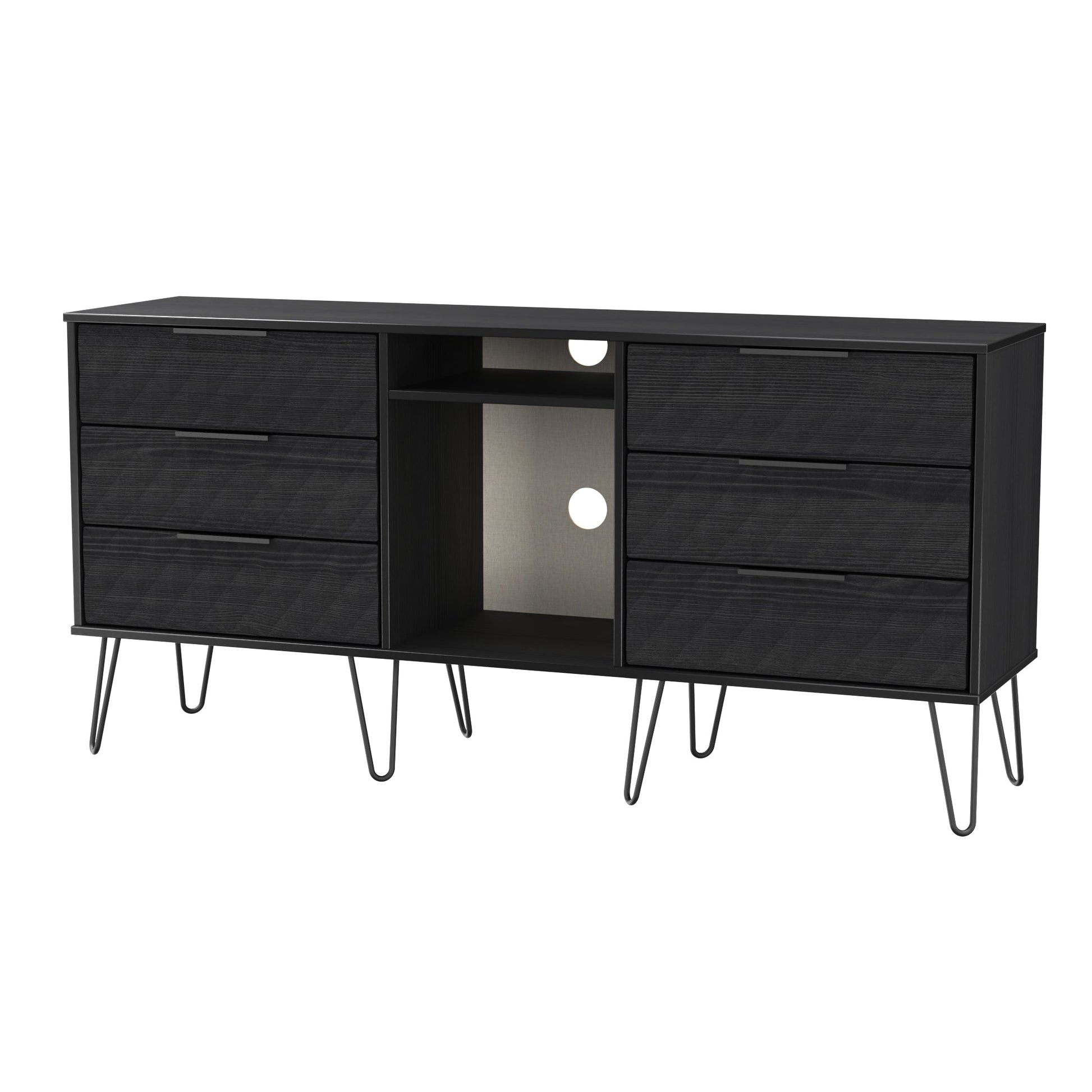This wide storage unit features 6 storage drawers with a central shelf. Suitable for use as a TV/Media unit or sideboard. A modern and distinctive range. This ranges unique aesthetic is best represented by the distinctive "Harlequin" patten of the drawer and door fronts. Also features Black Metal Handles and Black Hairpin Legs. Comes in a wide range of colours including eye cathching two tone colour combinations. All our furniture is made to order in the United Kingdom, to the highest quality using responsibly sourced materials. It is delivered within 10 working days direct to your location of choice by one of our two man delivery teams, and comes fully assembled (although items with legs will have those legs removed during transit to avoid damage). Part of the Harlequin Collection.