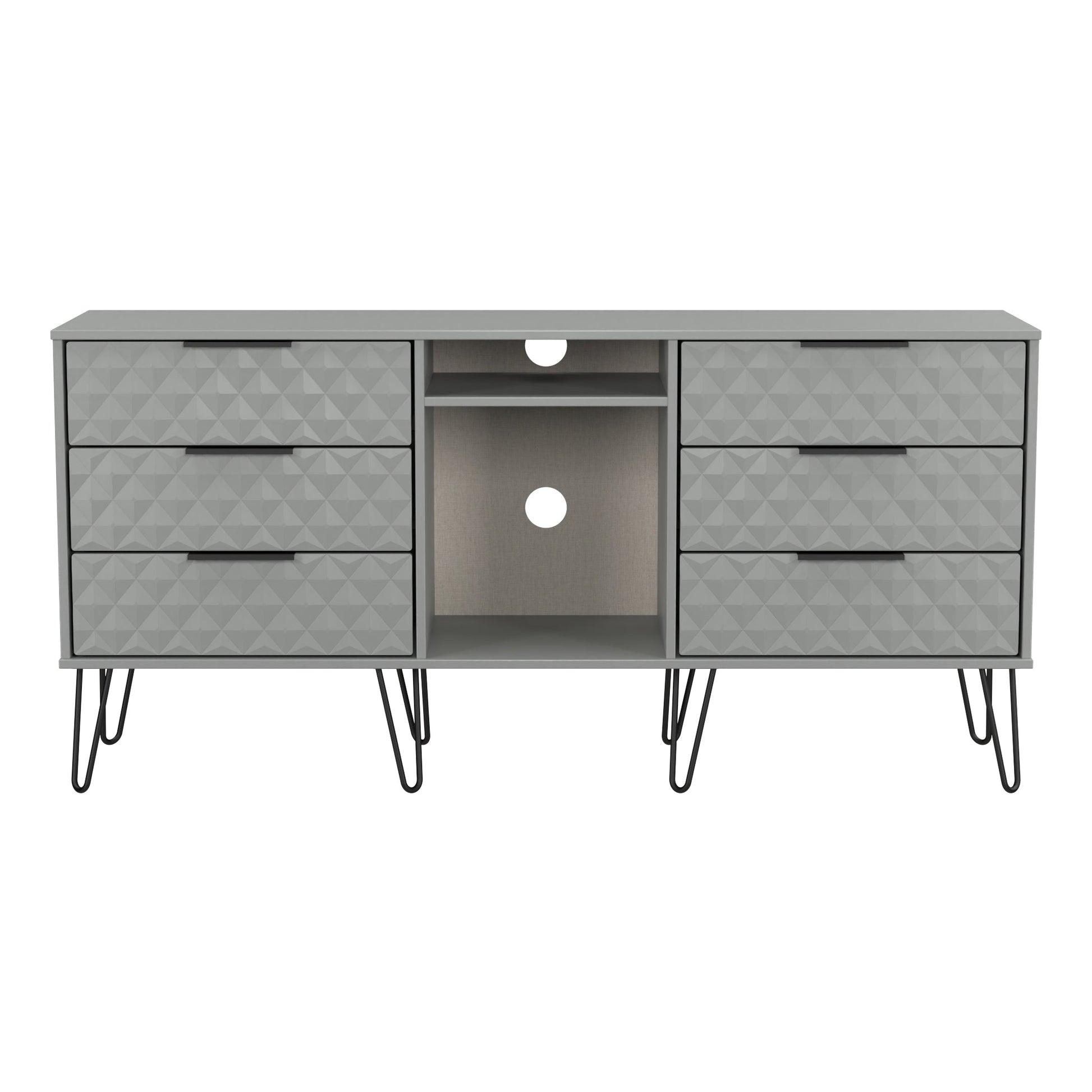 This wide storage unit features 6 storage drawers with a central shelf. Suitable for use as a TV/Media unit or sideboard. A modern and distinctive range. This ranges unique aesthetic is best represented by the distinctive "Harlequin" patten of the drawer and door fronts. Also features Black Metal Handles and Black Hairpin Legs. Comes in a wide range of colours including eye cathching two tone colour combinations. All our furniture is made to order in the United Kingdom, to the highest quality using responsibly sourced materials. It is delivered within 10 working days direct to your location of choice by one of our two man delivery teams, and comes fully assembled (although items with legs will have those legs removed during transit to avoid damage). Part of the Harlequin Collection.