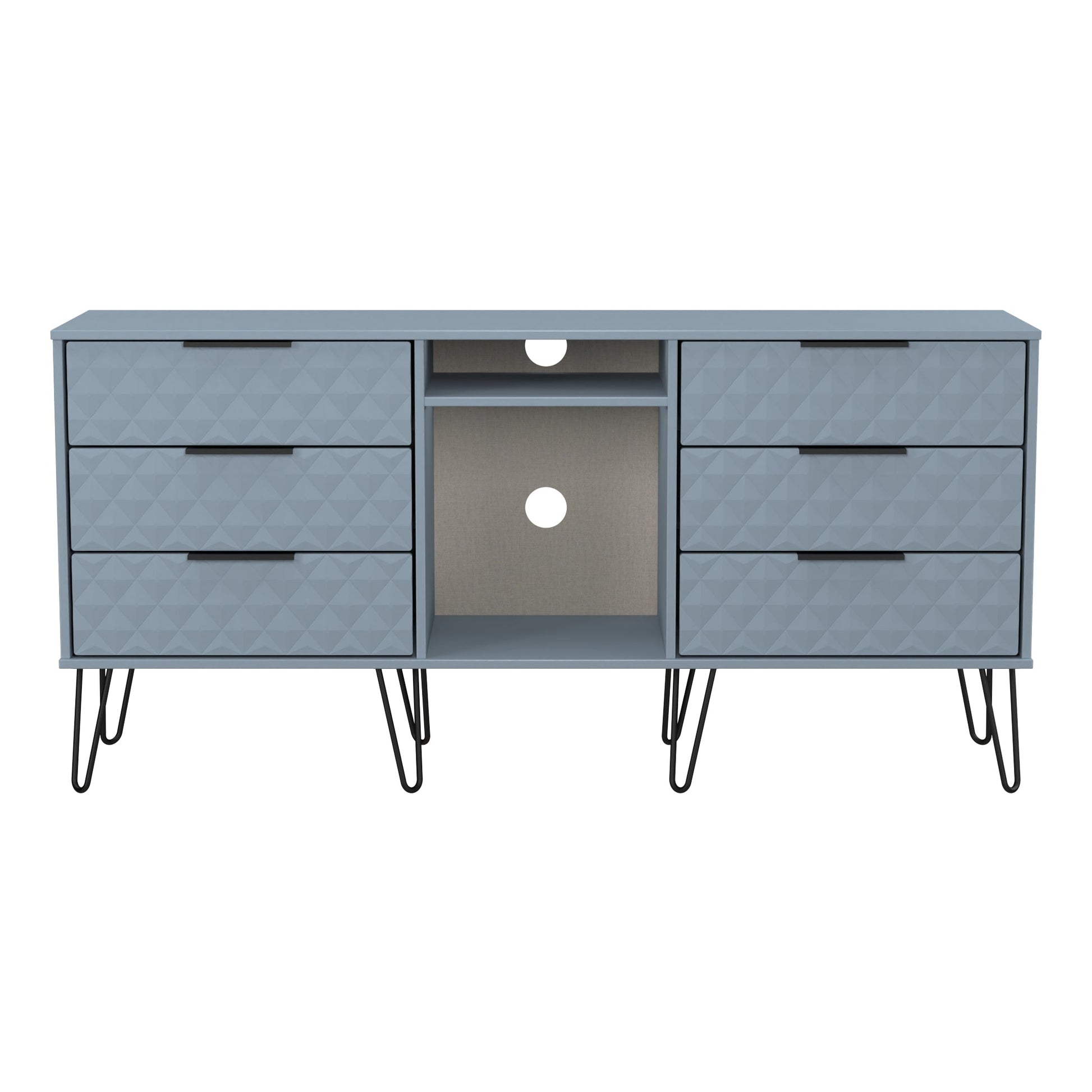 This wide storage unit features 6 storage drawers with a central shelf. Suitable for use as a TV/Media unit or sideboard. A modern and distinctive range. This ranges unique aesthetic is best represented by the distinctive "Harlequin" patten of the drawer and door fronts. Also features Black Metal Handles and Black Hairpin Legs. Comes in a wide range of colours including eye cathching two tone colour combinations. All our furniture is made to order in the United Kingdom, to the highest quality using responsibly sourced materials. It is delivered within 10 working days direct to your location of choice by one of our two man delivery teams, and comes fully assembled (although items with legs will have those legs removed during transit to avoid damage). Part of the Harlequin Collection.
